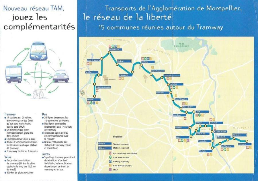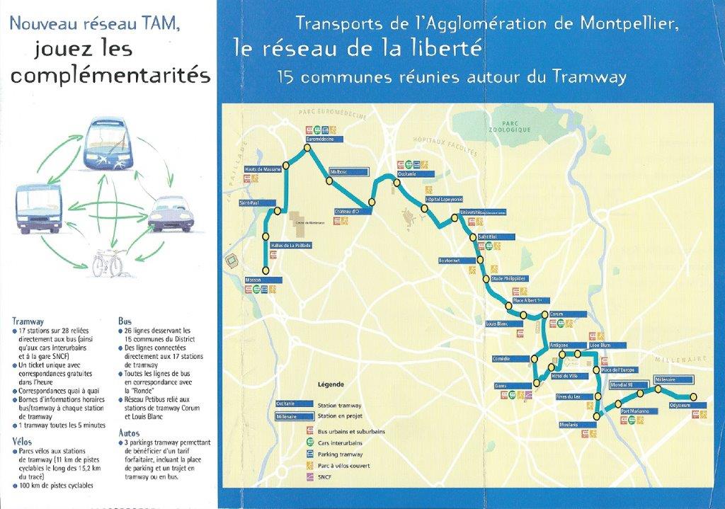 Plan de la ligne 1 de tramway moderne de Montpellier entrée en service commercial le lundi 3 juillet 2000, faisant partie intégrante du dépliant précité. Document Montpellier District