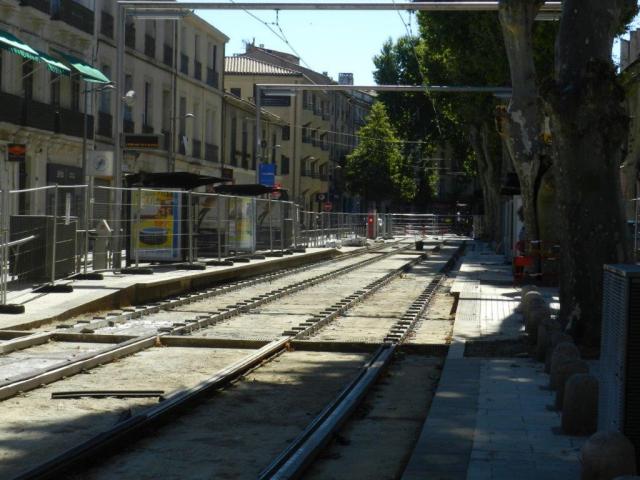 Sur le tronc commun des lignes 1 et 4 de tramway en travaux cet été 2020 entre la station « Corum » et la place Albert-1er en centre-ville de Montpellier, la première coulée de béton désactivé a été réalisée avant la station « Louis Blanc », à la hauteur de l’agence de la Caisse d’Epargne. Au vu des préparatifs, le revêtement de la plateforme en béton désactivé gagnera du terrain au niveau de la station précitée dans le courant de la présente semaine.