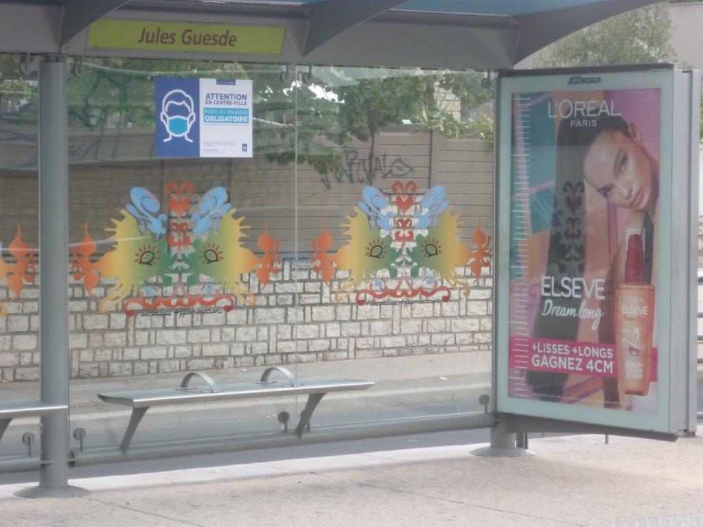 Elle commence à être visible dans les stations de tramway sur une des parois vitrées d’un des abris de chaque côté des voies et aux arrêts de bus dotés d’un abri.