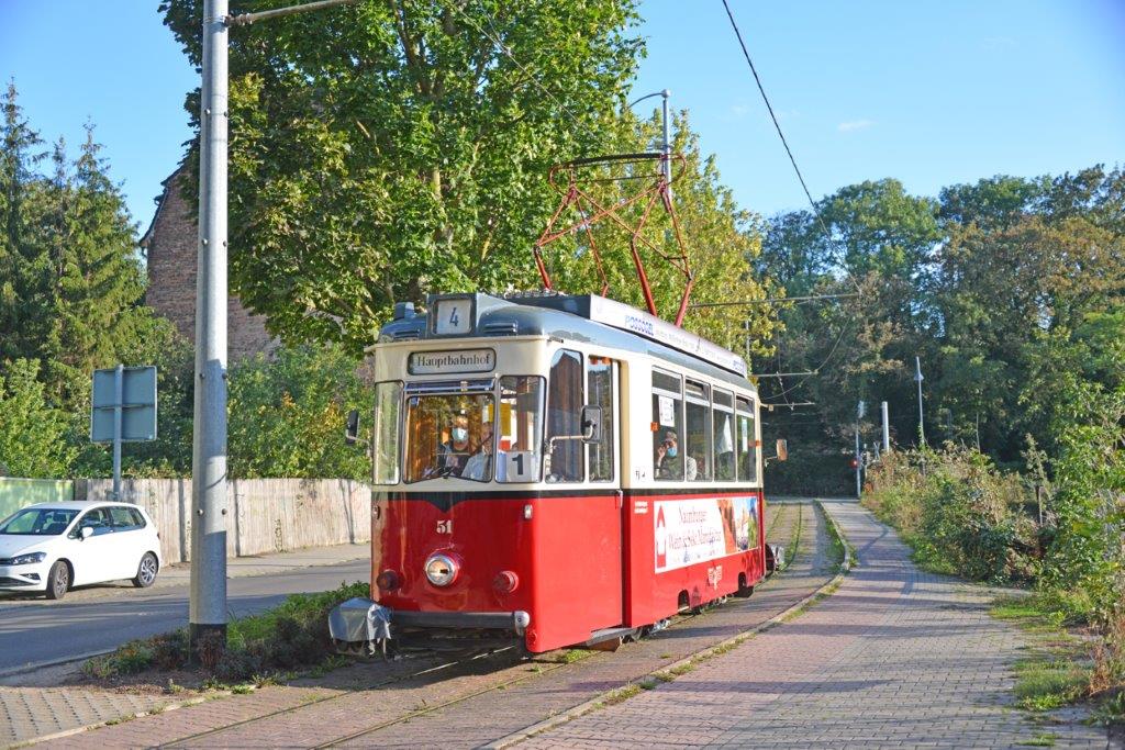 A 50 km au sud-ouest de Leipzig, la ville de Naumburg an der Saale, Land de Saxe-Anhalt, peuplée de 32 402 habitants (recensement de 2019), dispose à ce jour d’une seule ligne de tramway d’une longueur de 2,9 km à voie métrique et unique à double sens dotée de deux évitements, le premier situé juste avant le terminus « Hauptbahnhof » et le second à la station « Curt-Becker-Platz ». La ligne aérienne de contact est alimentée en courant continu 600 V.