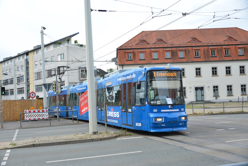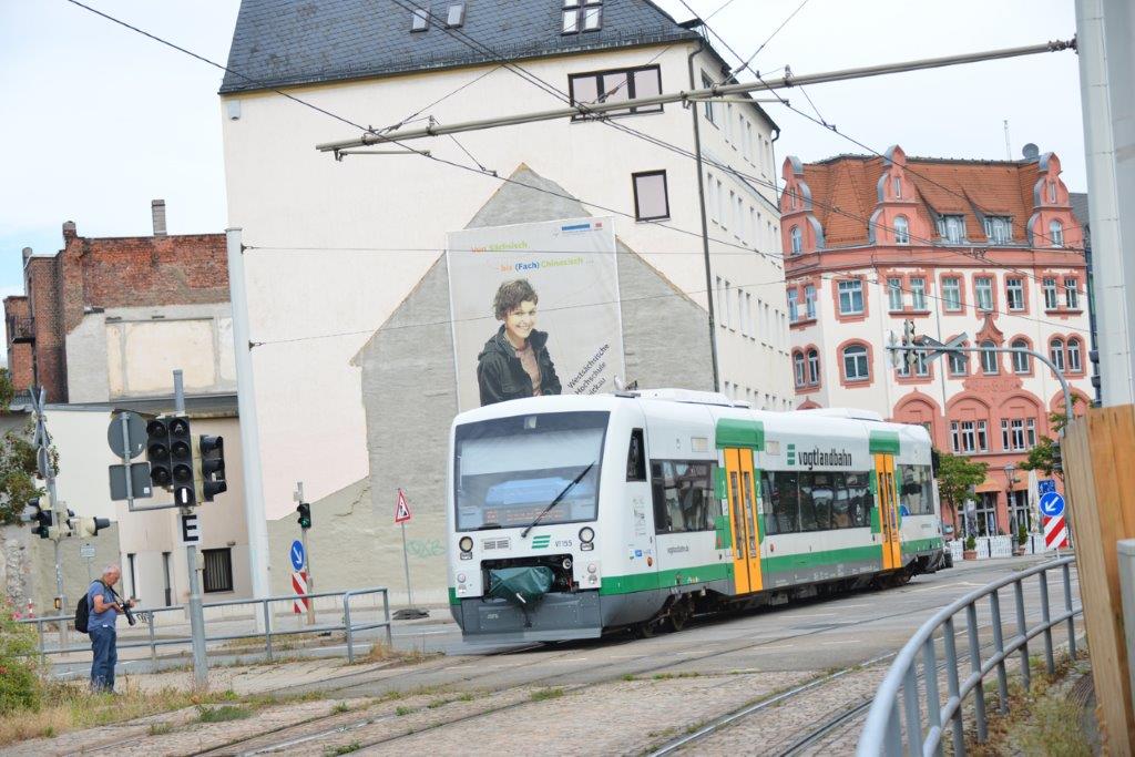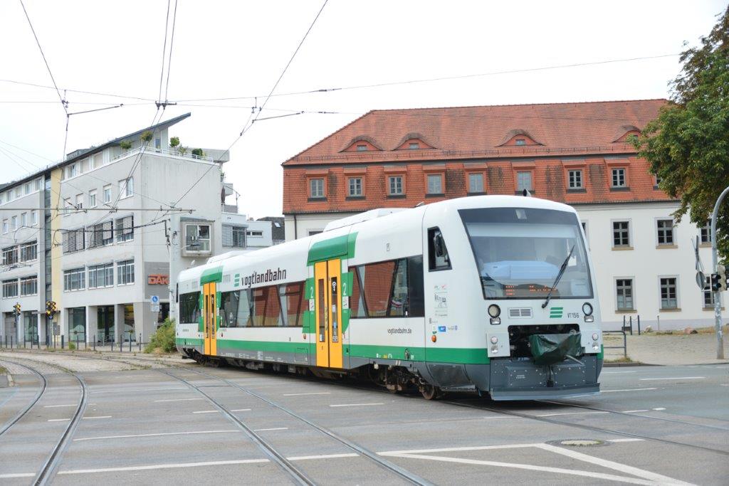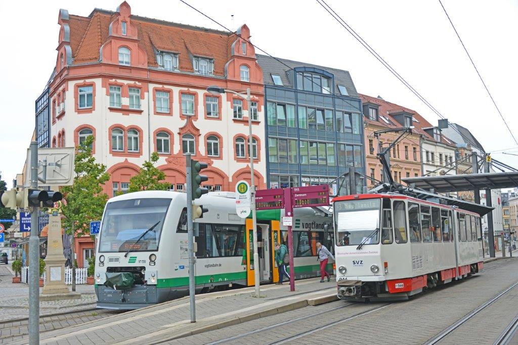 Si les tramways ont été remplacés par des bus de la ligne 10 pour la desserte de la gare principale de Zwickau depuis le dimanche 15 décembre 2019 et ce jusqu’à nouvel ordre, en raison de l’état délabré de la plateforme de la grande boucle de retournement qui dessert la gare, il n’empêche qu’il est toujours possible de rejoindre cette gare principale depuis le centre-ville de Zwickau et vice versa par le rail, grâce à la création d’une courte ligne de chemin de fer à double voie à l’écartement standard de 1 435 mm entrée en service commercial le vendredi 28 mai 1999. Au sud-ouest, cent mètres après la station « Reuterweg » la double voie à l’écartement de 1 000 mm de la ligne 3 de tramway devient parallèle à la double voie à l’écartement de 1 435 mm de la ligne de chemin de fer. Peu après la station « Stadthalle », du nom de la salle multifonction de la ville de Zwickau, aussi bien desservie par les tramways de la ligne 3 que par les autorails Regio-Shuttle RS1 Stadler siglés Vogtlandbahn spécialement équipés pour circuler en ville, les deux modes de transport utilisent la même plateforme dotée de six files de rails sur près de 1,5 km dans Äußere Schneeberger Straße. Alors que les tramways marquent l’arrêt dans deux stations implantées sur cette artère interdite à tout véhicule routier, exception faite des véhicules de secours, avant d’atteindre la station « Zentrum », les autorails filent directement jusqu’à cette dernière station qui correspond au terminus des lignes ferroviaires RB1 Kraslice (Tchéquie) – Falkenstein – Zwickau et RB2 Cheb – Hof/Adorf – Plauen – Zwickau, où une seule voie à quai leur est réservée. Il est à noter que les autorails siglés Vogtlandbahn sont exploités par la société Länderbahn GmbH qui dépend elle-même de la société Regentalbahn GmbH laquelle appartient à la filiale Ferrovie-dello-Stato Netinera (anciennement Arriva Allemagne).