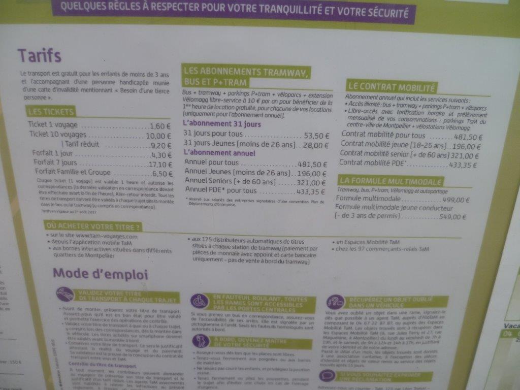 Afin que la clientèle TaM Montpellier 3M, qui réside dans la métropole montpelliéraine, ne passe pas à côté de la baisse de 10 % sur le tarif normal des abonnements, il est important que cet avantage soit mentionné sur les affichettes « Tarifs » consultables aux arrêts de bus et dans les stations de tramway du réseau TaM Montpellier 3M. Il suffirait d’ajouter un astérisque à droite de chaque tarif d’abonnement et d’indiquer un peu plus bas, à la droite de l’astérisque, qu’une réduction de 10 % sur le tarif s’applique aux résidents de la Métropole selon les conditions disponibles sur le site TaM Voyages ou sur l’appli TaM. Pour ce qui est des abonnements PDE (plan de déplacements d’entreprise), un second astérisque serait ajouté.