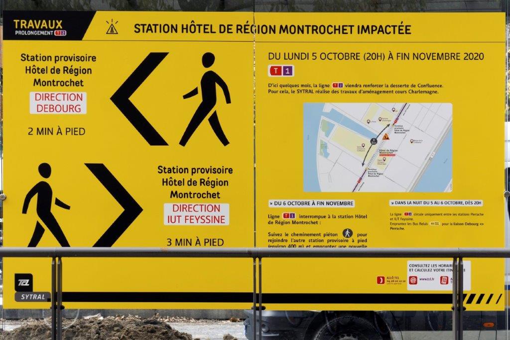 Les travaux dits « d’adaptation », consistant en l’installation d’appareils de voie permettant l’entrée et la sortie de la zone dite « de retournement », ainsi que la mise en place de la communication simple, ont débuté le mardi 6 octobre 2020 et se prolongeront jusqu’au lundi 23 novembre 2020. Durant cette période, la ligne T1 comprend deux sections, la première entre le terminus « IUT Feyssine » et la station provisoire nord « Hôtel de Région – Montrochet » et la seconde entre la station provisoire sud « Hôtel de Région – Montrochet » et le terminus « Debourg ». Selon le chemin emprunté, il faut compter 2 ou 3 minutes à pied pour se rendre d’une station provisoire à l’autre.