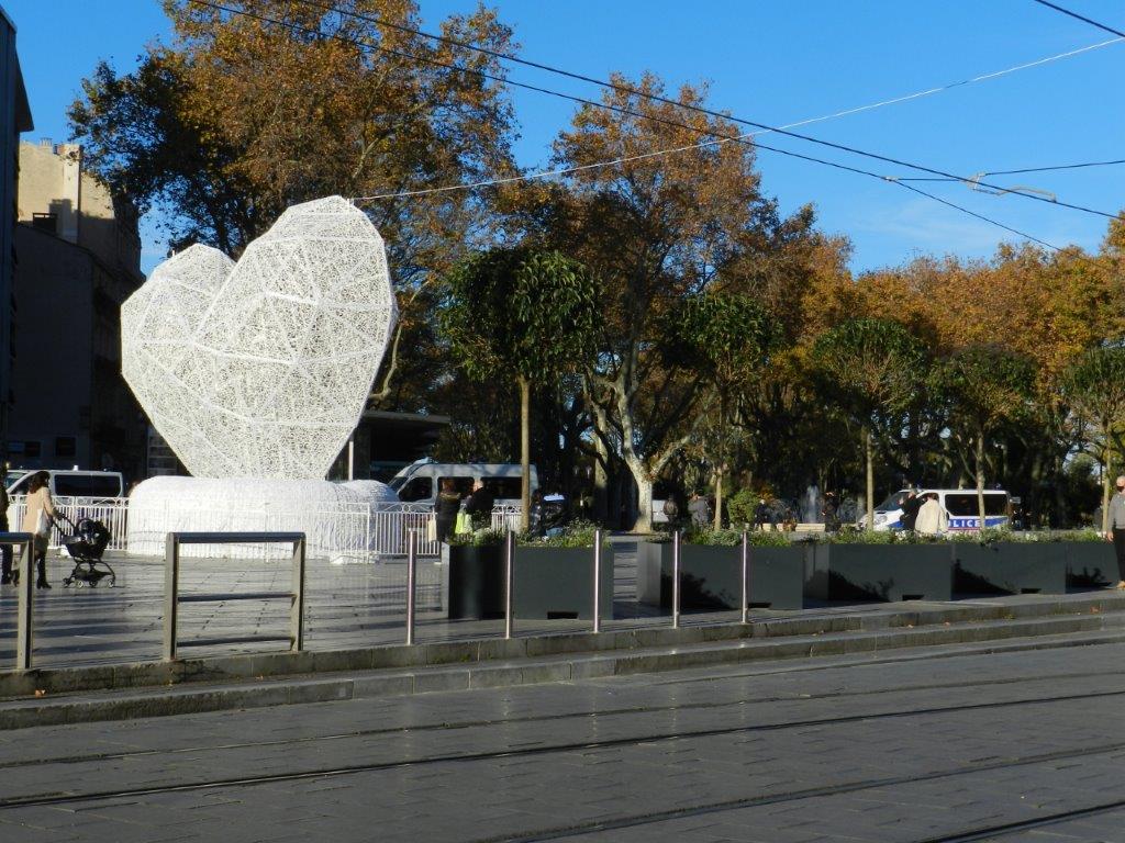 Exit la mappemonde de Noël. En cette année particulière, Michaël Delafosse, élu maire de Montpellier le dimanche 28 juin 2020, a choisi de faire installer sur l’emblématique place de la Comédie un cœur géant de 8 m de haut et de 3,8 m de large dans sa partie basse. Il repose sur un coussin de 1,4 m de haut et de 4,7 m de diamètre.