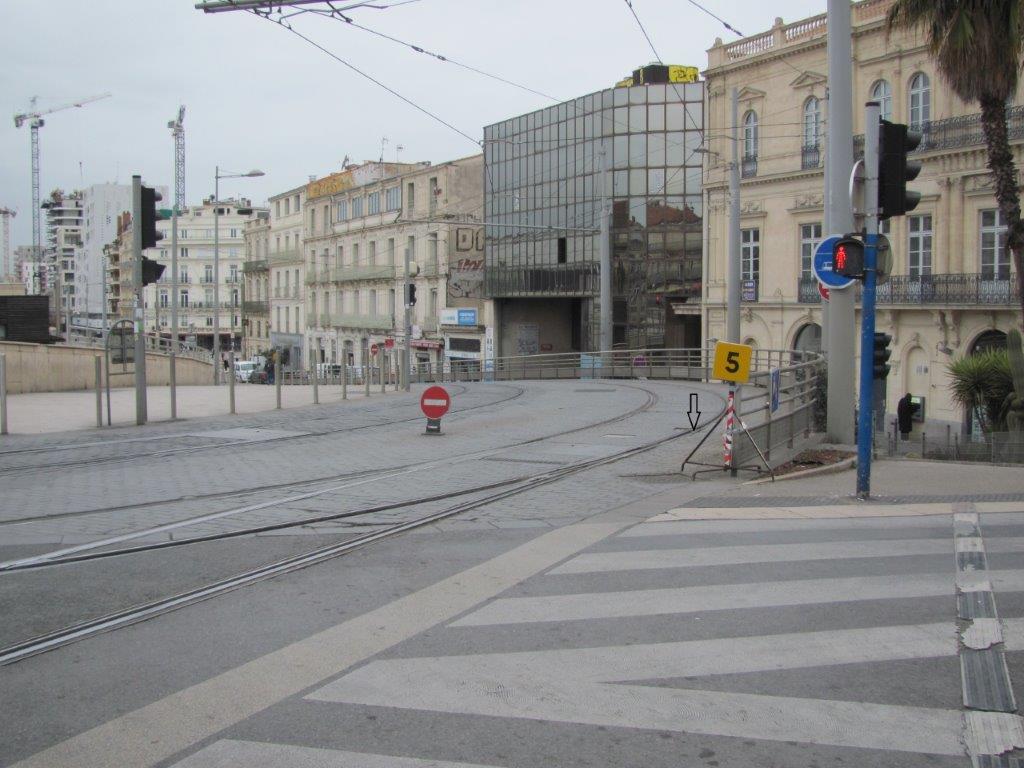 Dans le haut de la rue Jules-Ferry à Montpellier, sur le petit tronçon commun aux lignes 1 et 3 de tramway, la vitesse est limitée à 5 km/h sur une cinquantaine de mètres sur voie 2 en raison d’un rail à gorge fendu.