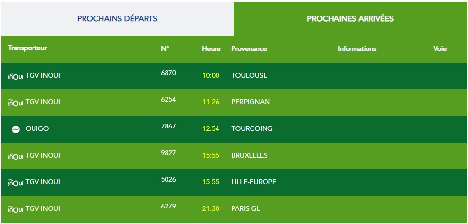 Ce samedi 13 mars 2021, à la gare de Montpellier Sud de France, seuls cinq arrivées et cinq départs sont programmés. Ces mouvements correspondent à trois TGV inOui de passage (arrivée et départ), deux TGV, dont un composé de deux rames, la première en provenance de Bruxelles et la seconde de Lille, ayant pour terminus la gare excentrée montpelliéraine et deux TGV, un Ouigo et un inOui, ayant pour origine ladite gare.