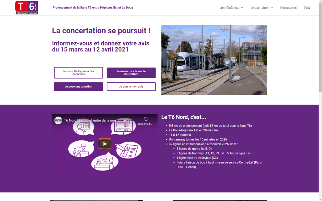 Dans le cadre du projet du prolongement nord de la ligne T6 du réseau de tramways du Grand Lyon, dont une première section de 6,7 km de long entre « Debourg » (Lyon 7e) et « Hôpitaux Est – Pinel » (Lyon 3e et Bron) a été mise en service commercial le vendredi 22 novembre 2019, une deuxième phase de concertation débute ce lundi 15 mars 2021 et prendra fin le lundi 12 avril 2021.