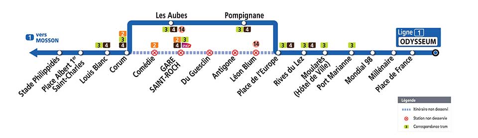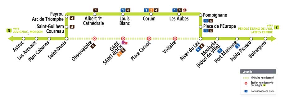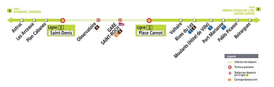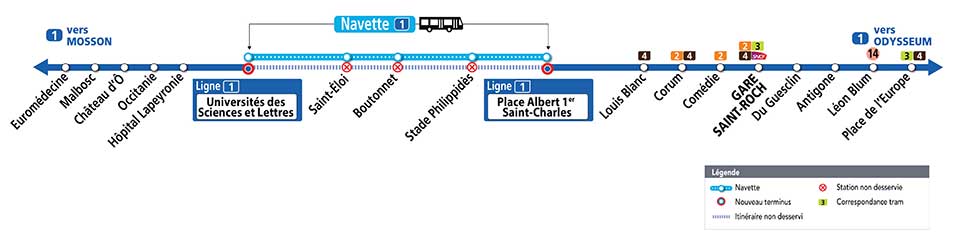 Le service de la ligne 1 de tramway sera interrompu entre les stations « Universités des Sciences & Lettres » et « Place Albert 1er – Saint-Charles », le vendredi 30 avril 2021 de 22h jusqu’à la fin du service, soit pendant des heures de couvre-feu. Une navette minibus de remplacement Navette 1 desservira les stations situées entre « Universités de Sciences & Lettres » et « Albert 1er – Saint-Charles », toutes les 15 minutes environ. Info et document TaM Montpellier 3ML’itinéraire de la ligne 1 sera dévié par l’itinéraire de la ligne 4 entre les stations « Corum » et « Place de l’Europe », le dimanche 2 mai 2021, durant toute la journée. Info et document TaM Montpellier 3MLe service de la ligne 3 sera interrompu entre les stations « Saint-Denis » et « Place Carnot », le dimanche 2 mai 2021, du début du service jusqu’à 12h environ. La station « Observatoire » sera desservie par la ligne 4 de tramway et la station « Gare Saint-Roch » par les lignes 2 (rue Maguelone) et 4 (rue de la République). Info et document TaM Montpellier 3ML’itinéraire de la ligne 3 sera dévié par l’itinéraire de la ligne 4 entre les stations « Saint-Denis » et « Rives du Lez », le dimanche 2 mai 2021, de 12h environ, jusqu’à la fin du service. Info et document TaM Montpellier 3M
