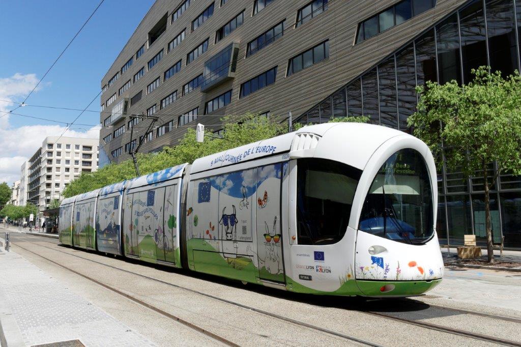 Pour célébrer le « Joli mois de l’Europe », plusieurs villes françaises ont chacune paré une de leurs rames de tramway des couleurs du Pacte Vert pour l’Europe. A l’instar de Brest (rame 1010), Grenoble (rame 6010), Marseille (rame 004), Montpellier (rame 2099), Nice (022), Orléans (rame 47), Strasbourg (rame 2024), Tours ou Valenciennes (rame 26), une rame, la 826 Citadis 302 Alstom, opérant principalement sur les lignes T1 et T2 du réseau de tramways du Grand Lyon a revêtu pour un mois le pelliculage intégral « Pacte Vert pour l’Europe ».