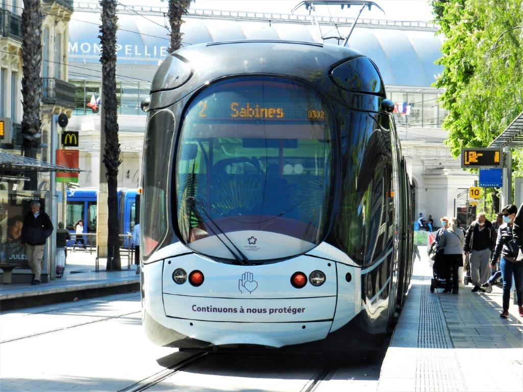 A Montpellier, depuis le lundi 11 mai 2020, les motrices des rames multilignes 2049 Citadis 302 Alstom, opérant sur la ligne 2 ou la ligne 4, et 2070 Citadis 402 Alstom, circulant sur la ligne 1 ou la ligne 3, arborent sur leur nez la représentation d’un masque chirurgical afin de rappeler à tout un chacun ce geste barrière indispensable à bord des bus et tramways.