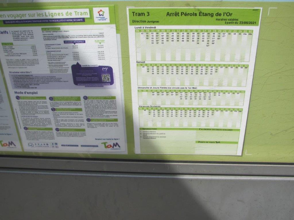 Depuis le jeudi de l’Ascension, 13 mai 2021, la desserte du terminus « Pérols – Etang de l’Or » de la ligne 3 de tramway a été renforcée le dimanche après-midi (ainsi que le lundi de Pentecôte, 24 mai 2021) et ce jusqu’au dimanche 27 juin 2021. La fiche horaire consultable au terminus précité indique « Horaires valables à partir du 23 mai 2021 » alors qu’en réalité, ceux du dimanche et jours fériés étaient entrés en vigueur depuis le jeudi de l’Ascension, 13 mai 2021.
