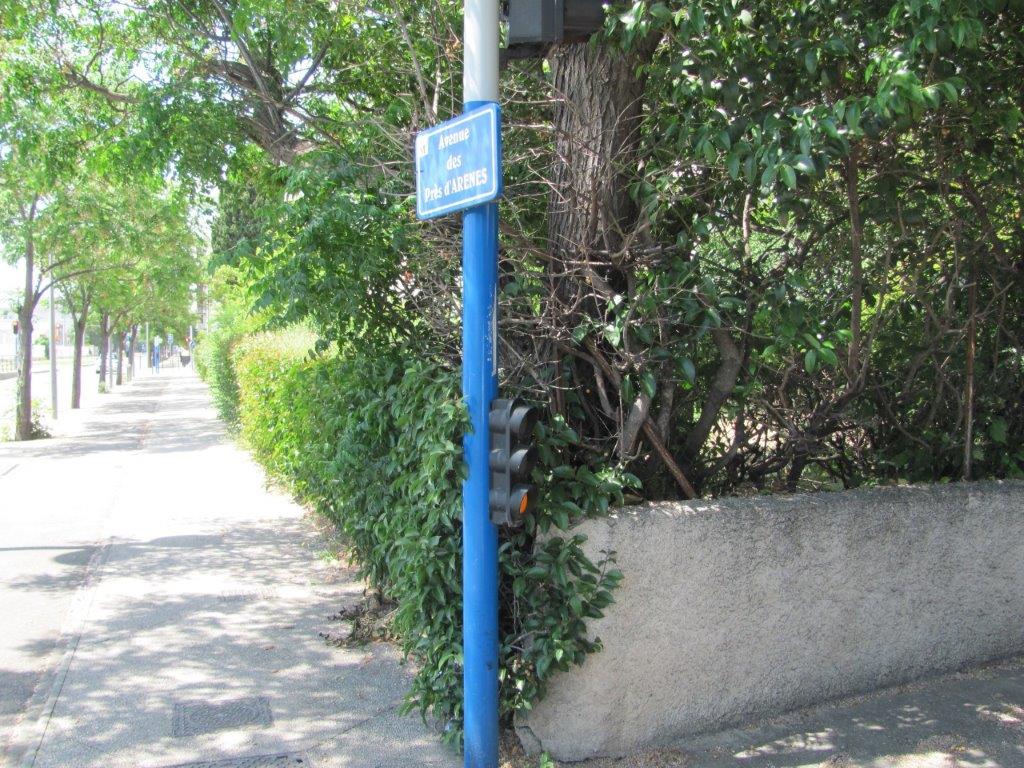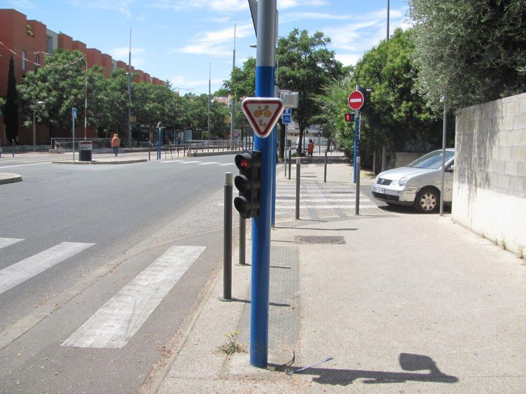 Avenue des Prés-d’Arènes à Montpellier, il existe deux petits panneaux triangulaires, l’un portant une flèche « va-tout-droit » et le second une double flèche « tourne-à-droite et va-tout-droit » qui pourraient se révéler très dangereux pour le cycliste insouciant effectuant un va-tout-droit dans la mesure où dans chaque situation on constate la présence d’un feu tricolore sur la droite, le premier à la sortie d’une propriété privée (Happy Dog pour le situer), et le second, un peu plus loin, au débouché de la rue des Pivoines, d’où peuvent surgir un ou plusieurs véhicules automobiles dès l’instant où le feu va passer au clignotant orange pour le premier et au vert pour le second.