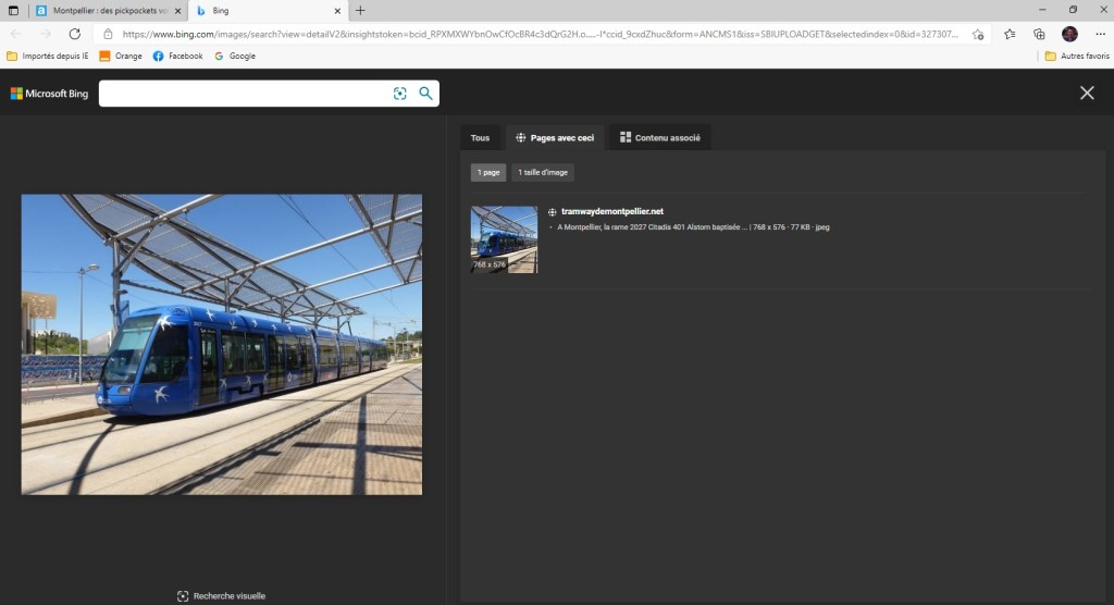 Une page du moteur de recherche Microsoft Bing s’ouvre aussitôt. A droite de la photo sélectionnée, il peut être précisé sous l’onglet « Tous » ou « Pages avec ceci » la ou les pages où la photo en question a déjà été utilisée. Dans notre exemple, tout un chacun peut constater que la photo a été mise en ligne par tramwaydemontpellier.net. Un clic gauche sur le lien indiqué ouvre la page dédiée à la photo faussement attribuée à la photothèque de la Ville de Montpellier.