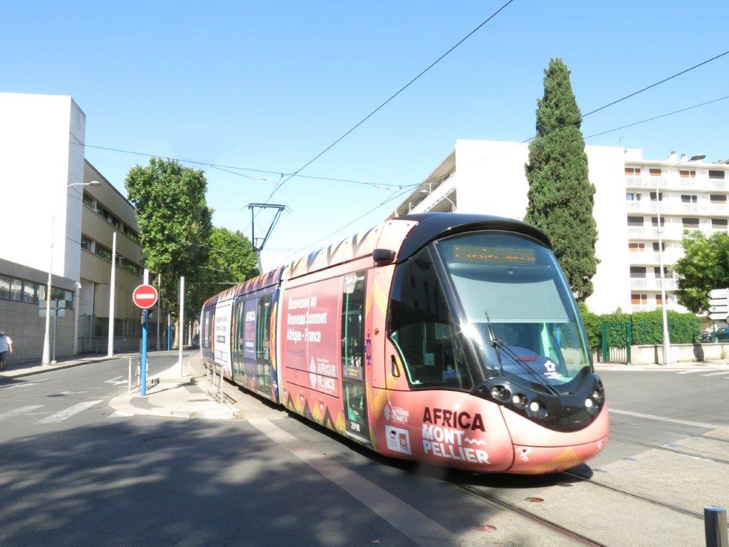 La rame 2098 Citadis 402 Alstom multiligne, qui opère selon les jours sur la ligne 1 ou sur la ligne 3 du réseau de tramways de Montpellier, est intégralement habillée aux couleurs du Nouveau Sommet Afrique – France qui se tiendra à Montpellier les jeudi 7, vendredi 8 et samedi 9 octobre, si la situation sanitaire le permet d’ici là.