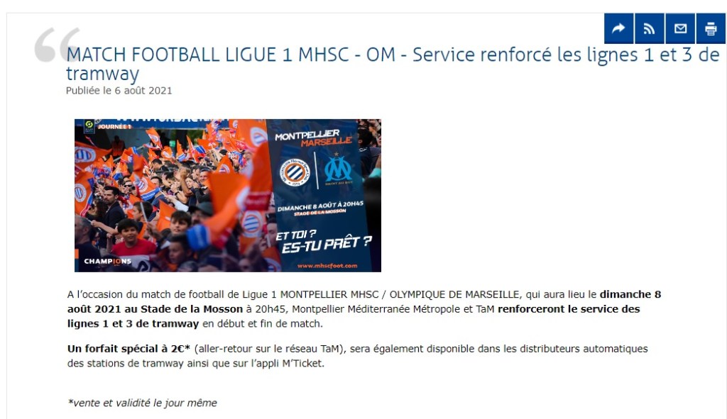 Dans une info publiée à la rubrique Actualités de son site internet, sur sa page Facebook et sur son compte Twitter, ce vendredi 6 août 2021, sous le titre « MATCH FOOTBALL LIGUE 1 MHSC – OM – Service renforcé (sur) les lignes 1 et 3 de tramway« , TaM Montpellier 3M fait totalement l’impasse sur le Pass week-end gratuit.