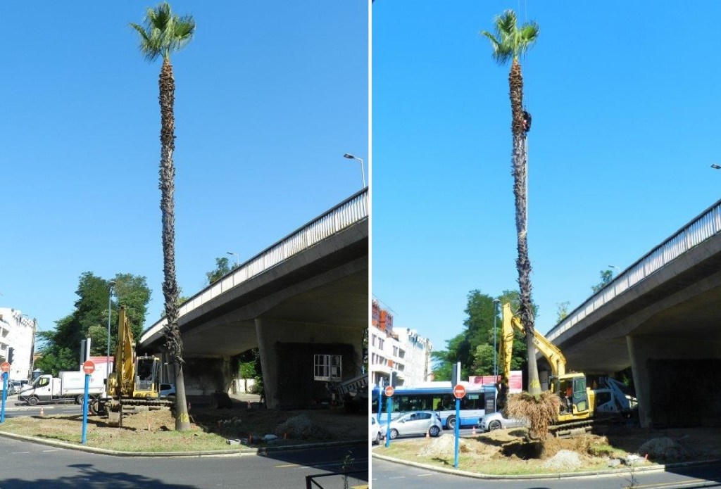 Dans le cadre des premiers travaux préparatoires à la réalisation de la ligne 5 de tramway sur sa partie ouest, le dernier des 39 palmiers de la place du 8 Mai 1945 à Montpellier a quitté les lieux le lundi 9 août 2021 à 11h40 par convoi exceptionnel en direction d’un des deux sites retenus pour sa transplantation où il retrouvera la plupart de ses congénères.