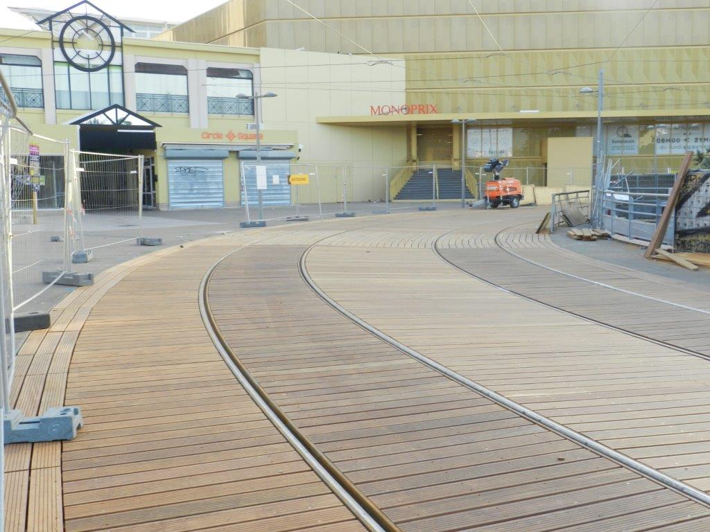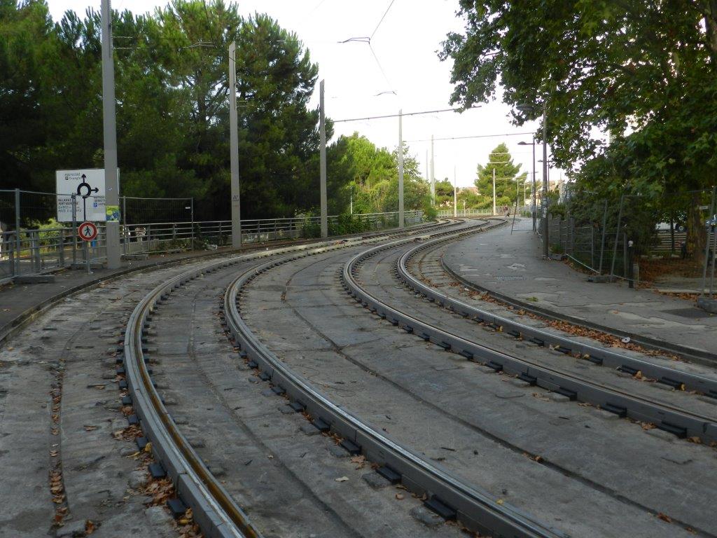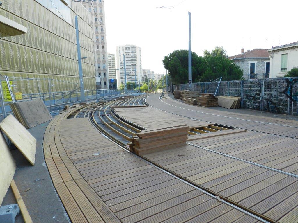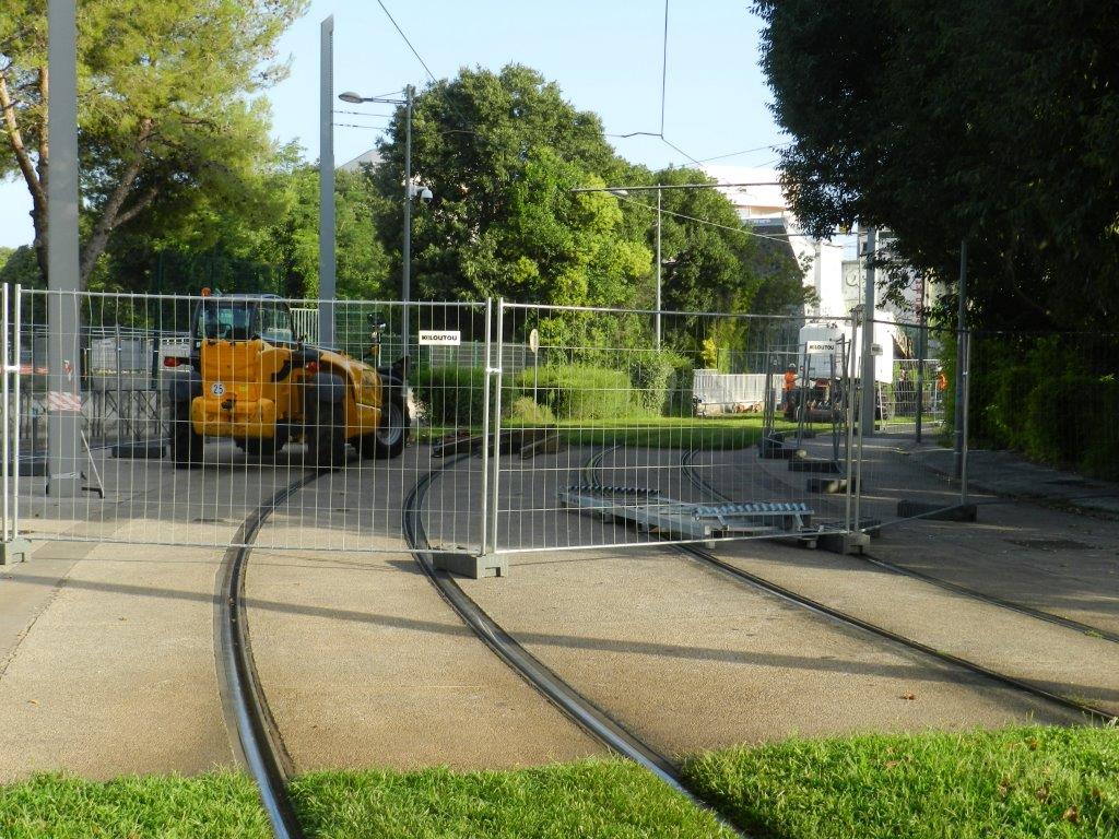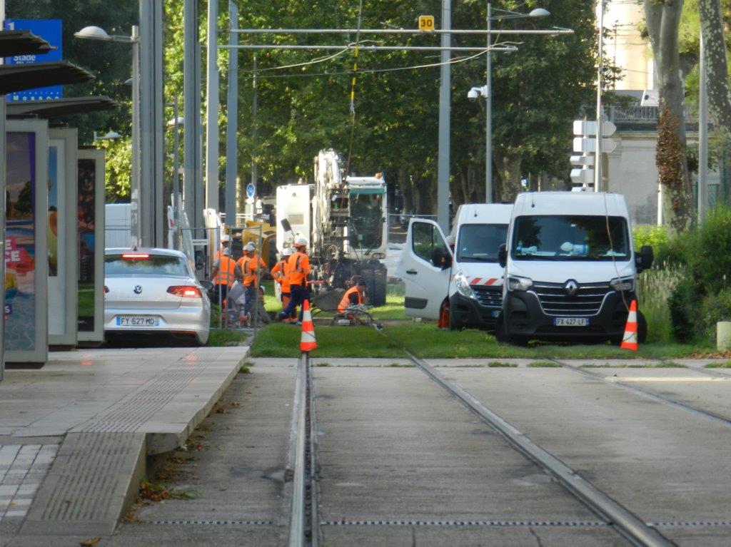 Calme plat sur l’avenue Henri-Frenay, entre les stations « Antigone » et « Du Guesclin », où la pose du platelage bois n’a pas encore atteint la mi-pente. Compte tenu de la présence de projecteurs, il y a lieu de supposer que le chantier se poursuivra également en nocturne, les travaux devant être impérativement achevés d’ici au dimanche 29 août 2021.