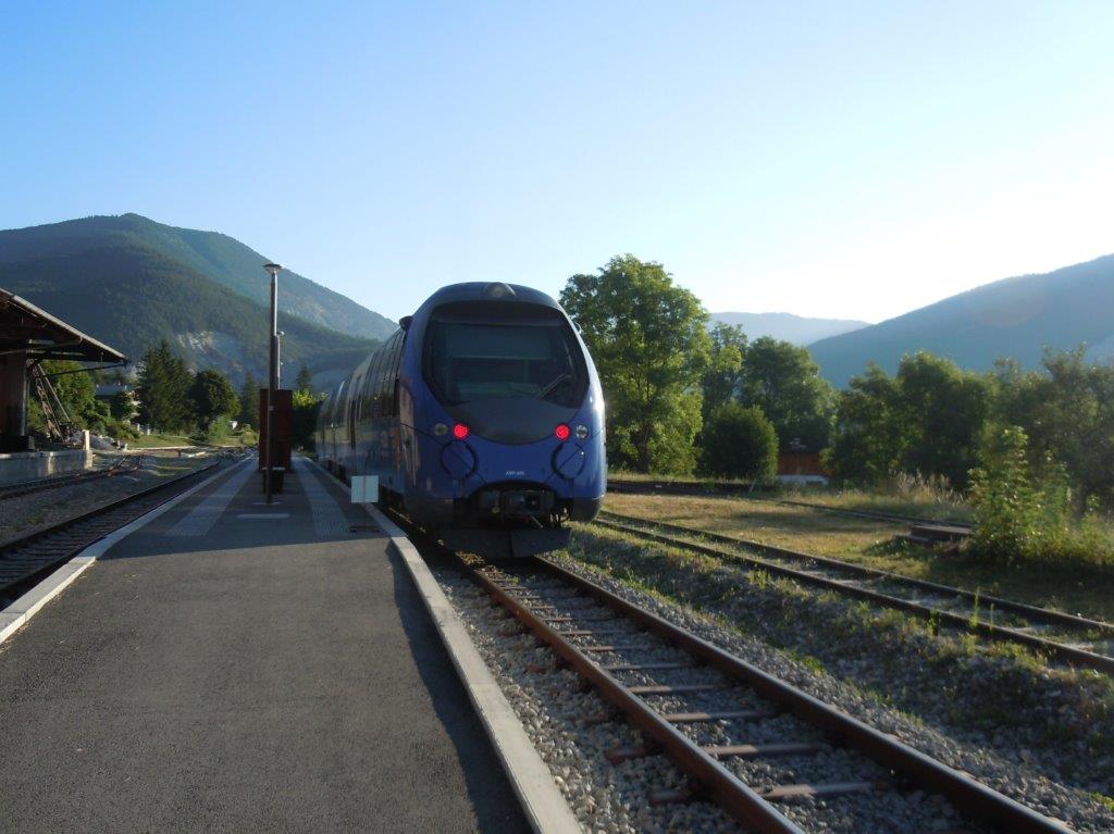 Sur les photos prises le mercredi 18 août 2021, l’autorail articulé double motrice AMP 805/806, revêtue de la nouvelle livrée « ZOU ! », s’apprête à quitter la gare de Saint-André-les-Alpes à 8h12 à destination de Nice après avoir avoir embarqué les voyageurs de l’autocar de substitution en provenance de Digne. Une rupture de charge pénalisante pour cette très attachante ligne.