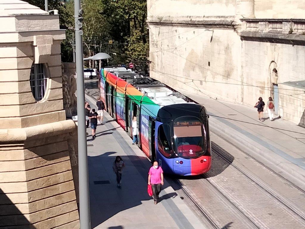 A sa place, elle vient de revêtir pour quelques jours un habillage intégral annonçant la Marche des fiertés organisée à Montpellier le samedi 25 septembre 2021 dont le rassemblement des participants est fixé à 14h aux Jardins du Peyrou, à deux pas de la station « Peyrou – Arc de Triomphe » desservie par la ligne 4 de tramway, avant que le cortège très bariolé ne s’engage à 16h sur un parcours pratiquement identique à celui qui est imposé par le préfet de l’Hérault à la procession des anti-vaccin et/ou anti-pass sanitaire.