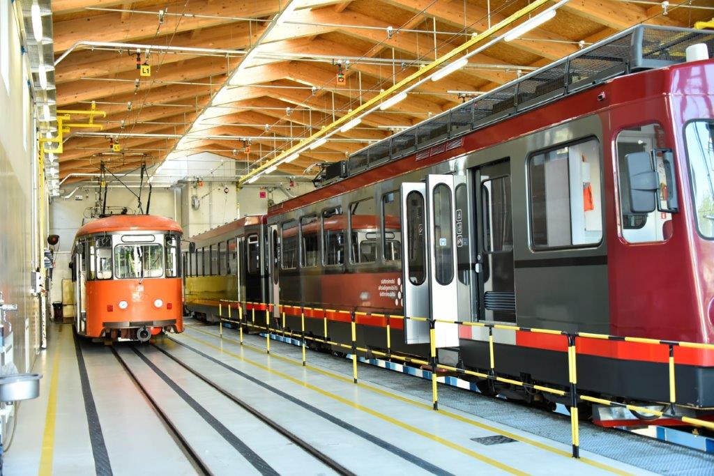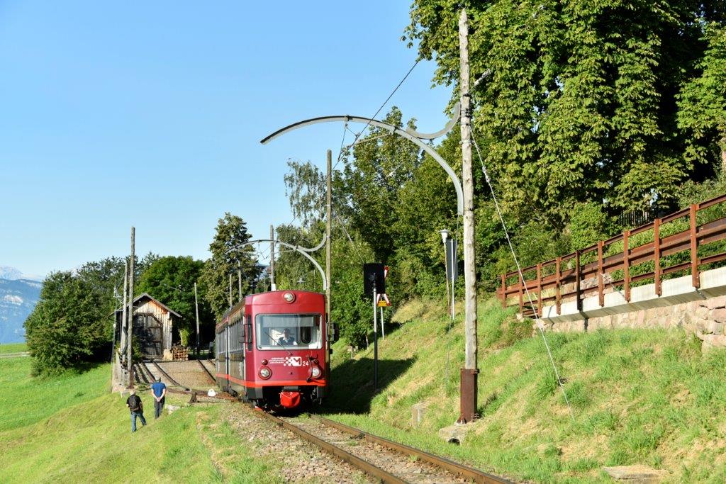 Le mardi 24 août 2021 au matin, à Soprabolzano, les deux motrices à deux essieux n° 11 et 12, respectivement construites en 1907 et 1908 par l’Autrichien Grazer Waggonfabrik, sont garées. La n° 11 sert de véhicule de service et la n° 12 sort uniquement à l’occasion de circulations spéciales. La motrice n° 105 Alioth de 1910, équipée de deux bogies moteurs, est invisible, mais la motrice n° 2, dotée elle aussi de deux bogies moteurs, construite en 1908 par l’Autrichien Grazer Waggonbabrik, manoeuvre en gare à 8h08. Des deux motrices de tramway T4 Esslingen de 1958 qui assuraient le trafic régulier en 2007, année d’une première visite de la ligne, avec la motrice n° 105 Alioth, il n’en reste qu’une, la n° 12, la seconde, la n° 13 ayant rejoint un musée à Stuggart en Allemagne.