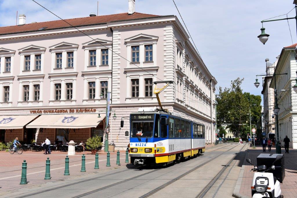 Le dimanche 1er mars 1857, le service de bus hippomobiles commence à Szeged. Il relie la gare principale au centre-ville et à quelques auberges importantes de la cité. Après que la ville a été presque entièrement détruite par une inondation catastrophique en 1879, elle est reconstruite avec l’aide internationale. Par la suite, le besoin de transports en commun s’accroit et la première ligne de tramway hippomobile est ouverte aux voyageurs le mardi 1er juillet 1884, le transport des marchandises étant assuré par des motrices à vapeur. Au tournant du siècle, le tramway hippomobile atteint ses limites de capacité. En conséquence, un plan d’électrification est présenté en 1899, mais il ne sera approuvé qu’en 1907. La première ligne de tramway électrique entre en service le jeudi 1er octobre 1908. Elle relie la gare principale de Szeged à la gare de Rókus via le centre-ville.