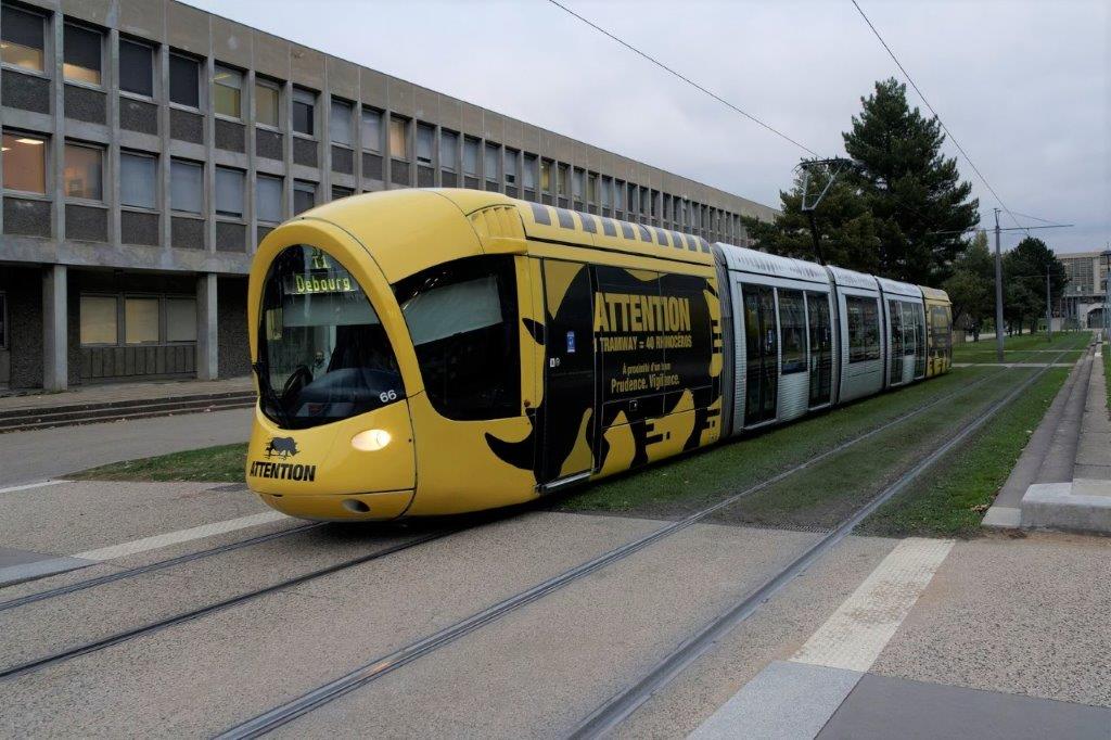Pour alerter les usagers sur les dangers du tramway à l’approche d’une station, les équipes du SYTRAL ont habillé la face avant et les faces latérales des motrices de la rame 866 Citadis 302 Alstom, qui opére sur la ligne T1 ou T2 , d’un rhinocéros noir sur fond jaune avec comme slogan sur chaque face latérale : « Attention 1 tramway = 40 rhinocéros A proximité d’un tram Prudence. Vigilance. »