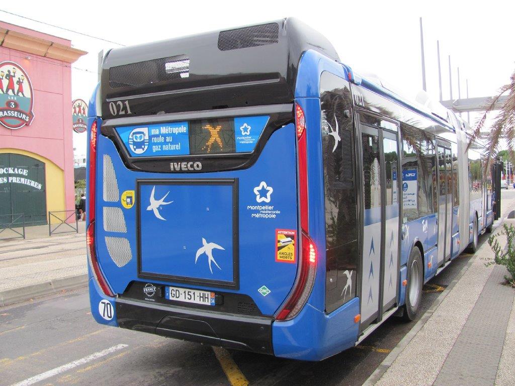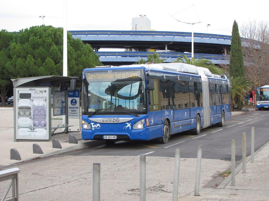 Les trois bus articulés Citelis 18 Irisbus à motorisation diesel achetés d’occasion, numérotés 021 (année 2007), 022 (année 2008) et 023 (année 2007), introduits au mois d’octobre 2019 sur la navette « Gare Montpellier Sud de France », qui relie dans les deux sens la place de France à la gare excentrée de Montpellier Sud de France depuis le samedi 7 juillet 2018, viennent d’être remplacés en ce début de mois de décembre 2021 par trois bus articulés Urbanway 18 Iveco Bus tout droit sortis d’usine équipés de moteurs au gaz naturel comprimé plus silencieux et n’émettant pas de particules.