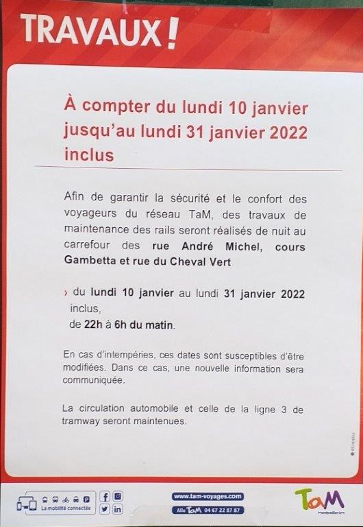 Dès ce soir, lundi 10 janvier 2022, des travaux de maintenance des rails seront effectués de nuit, de 22h à 6h du matin, jusqu’au lundi 31 janvier 2022 inclus, au carrefour rue André-Michel – Cours Gambetta – rue du Cheval-Vert. La circulation des rames opérant sur la ligne 3 sera toutefois maintenue entre 22h et la fin de service puis dès la reprise de service tôt le matin. Seuls les riverains ont été informés du déroulement de ces travaux nocturnes par voie d’affichettes scotchées sur les portes d’entrées d’immeubles.