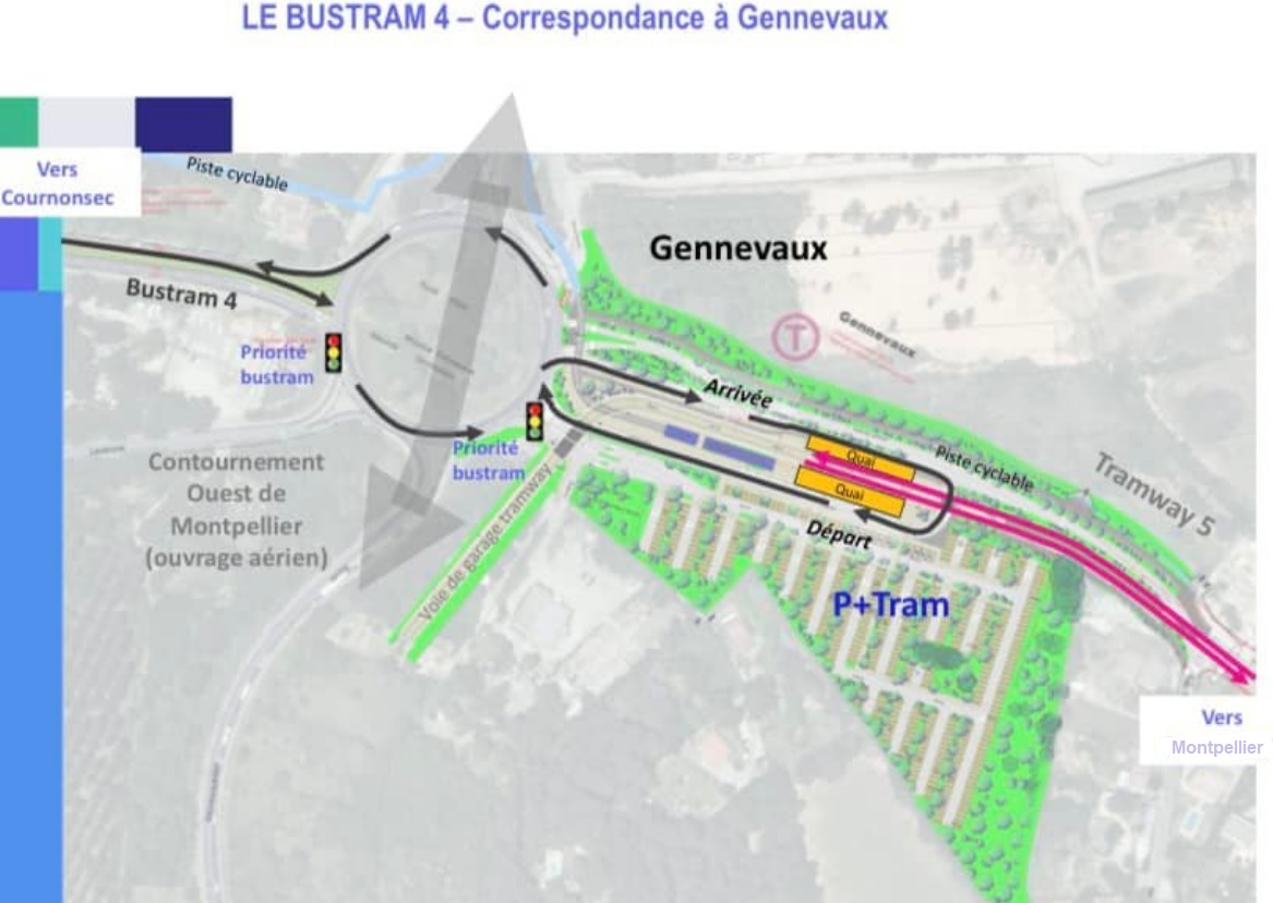 Une diapositive diffusée à l’occasion d’une réunion publique organisée à Pignan, le mardi 29 mars 2022, dans le cadre de la présentation aux populations concernées de la future ligne B4 de BusTram, qui reliera Cournonsec au rond-point Maurice-Gennevaux, dans sa partie védasienne, donne une idée de la future configuration du terminus ouest de la ligne 5 de tramway, qui pourrait porter le nom de « Porte de Lavérune », à défaut d’être situé sur la commune éponyme, où s’effectuera la correspondance entre la ligne 5 de tramway et la ligne B4 de BusTram et où sera réalisé un parking relais de surface d’une capacité de 450 places, le tout d’ici la fin de l’année 2025 si le calendrier des travaux peut être respecté.