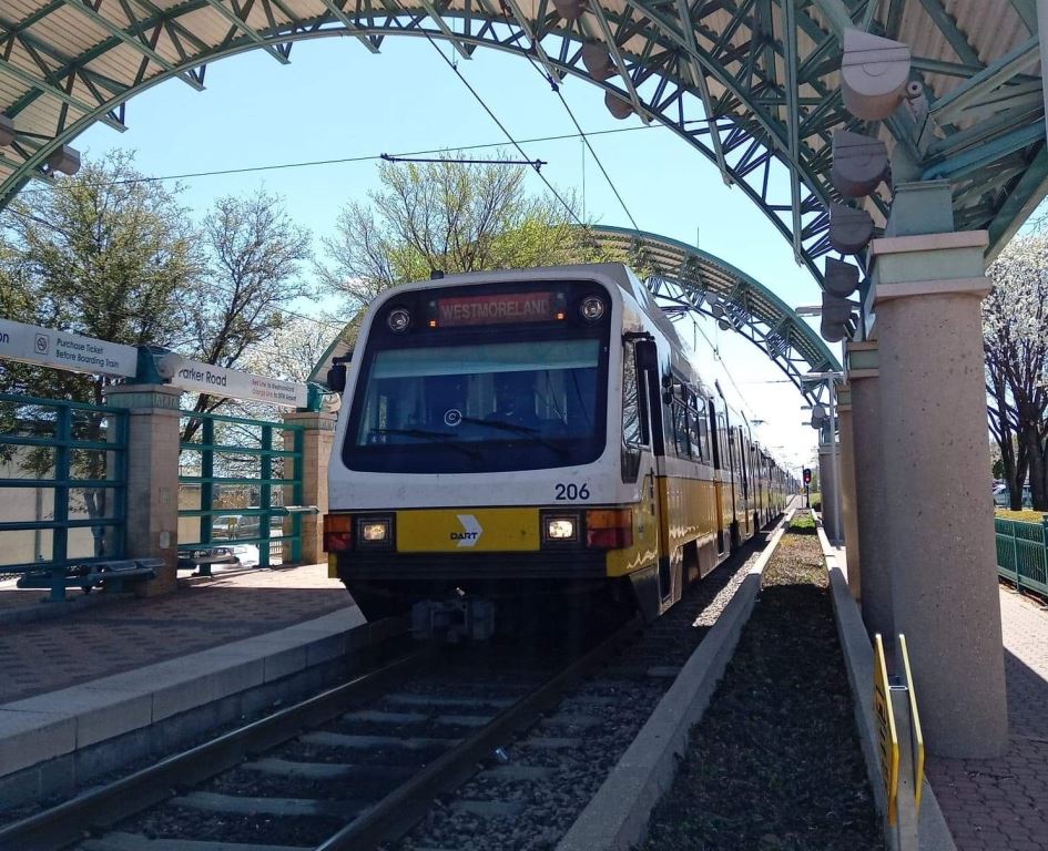 A Plano, au nord de Dallas, une unité multiple composée de deux rames SLRV Kinki Sharyo, n° 206 en tête, est photographiée à son arrivée au terminus nord de la ligne Rouge « Parker Road », le jeudi 31 mars 2022. La girouette indique d’ores et déjà le nom du terminus sud-ouest « Westmoreland ». Copyright : Karine D