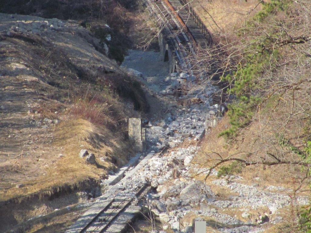Photographie de la partie émergée de la cabine numéro 1 du funiculaire de Saint-Hilaire-du-Touvet, stationnée dans la gare aval de Montfort dévastée par une coulée de lave torrentielle le mercredi soir 29 décembre 2021. Prise de vue en date du lundi 28 mars 2022. Copyright : Michel Bozzola
