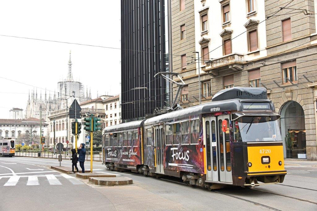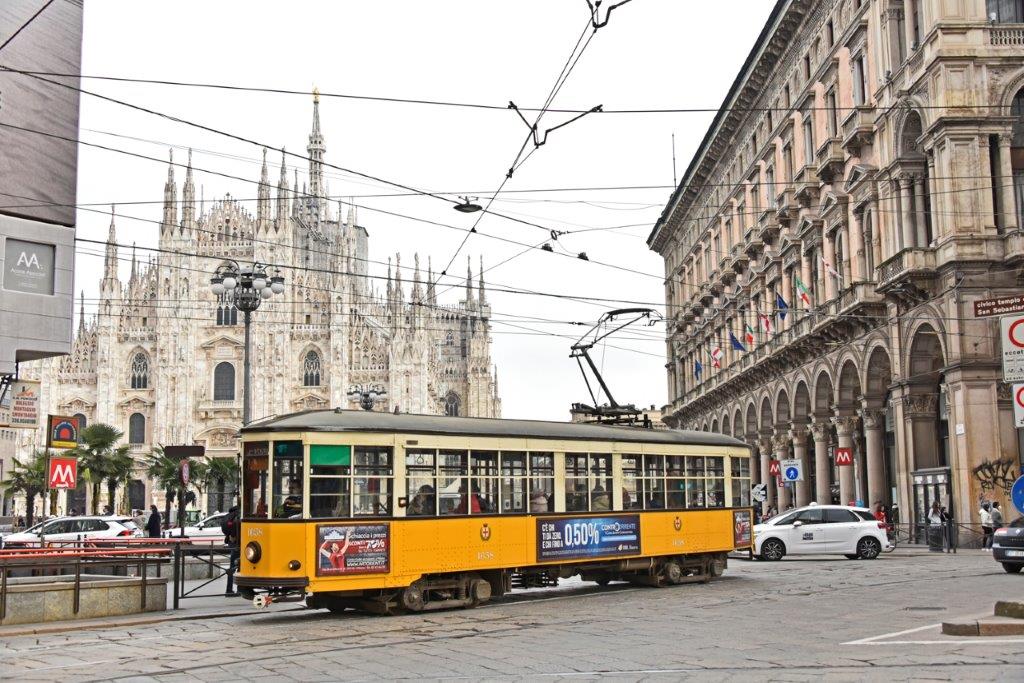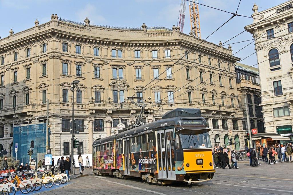 Piazza Cordusio à Milan, photographie de la motrice 1915 de la série 1500 Peter Witt construite en 1930, opérant sur la ligne 1 en direction du terminus « Greco », le samedi 12 mars 2022. Copyright : Thierry Leleu