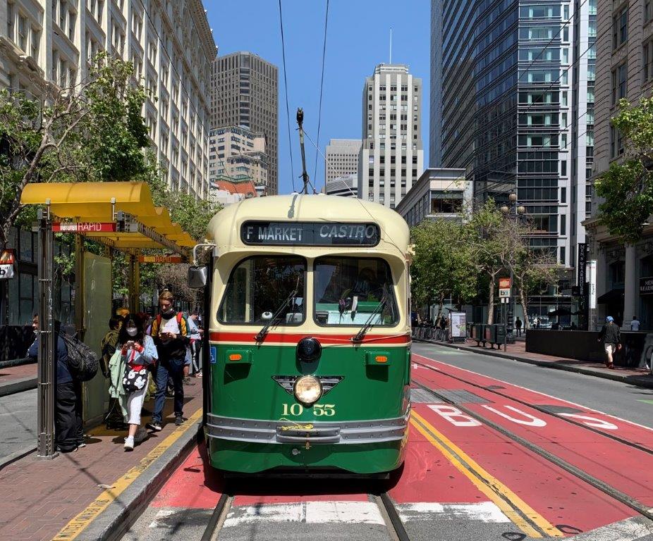 A San Francisco, photographie de la face avant caractéristique d’une motrice PCC, ici celle d’une 1050 Class numérotée 1055 revêtue de la livrée Philadelphia Transportation Company circulant sur la ligne F en direction de « Castro », le samedi 23 avril 2022. Copyright : DS7
