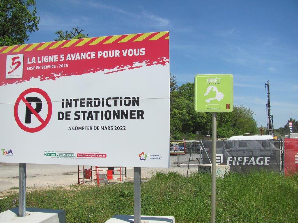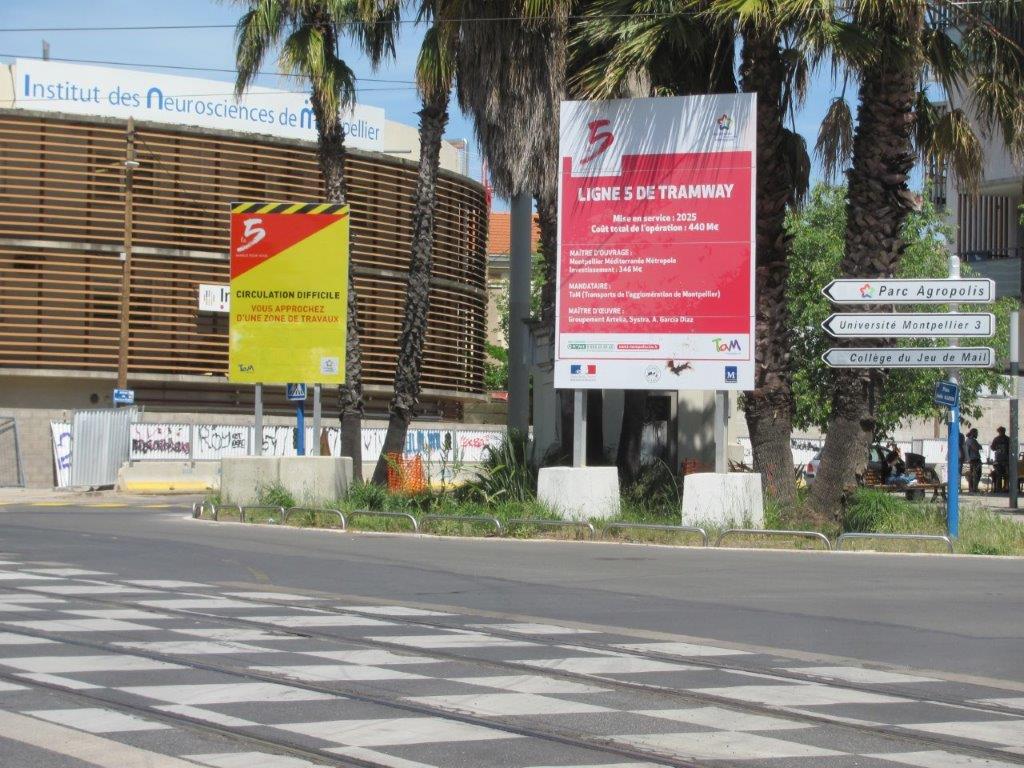 Les panneaux d’information, sur lesquels est mentionné le coût de la future ligne 5 de tramway, n’arborent plus le logo de la région Occitanie / Pyrénées-Méditerranée. Ce logo a été remplacé recemment par celui de France Relance. Même constatation sur le site officiel de la ligne 5 de tramway.