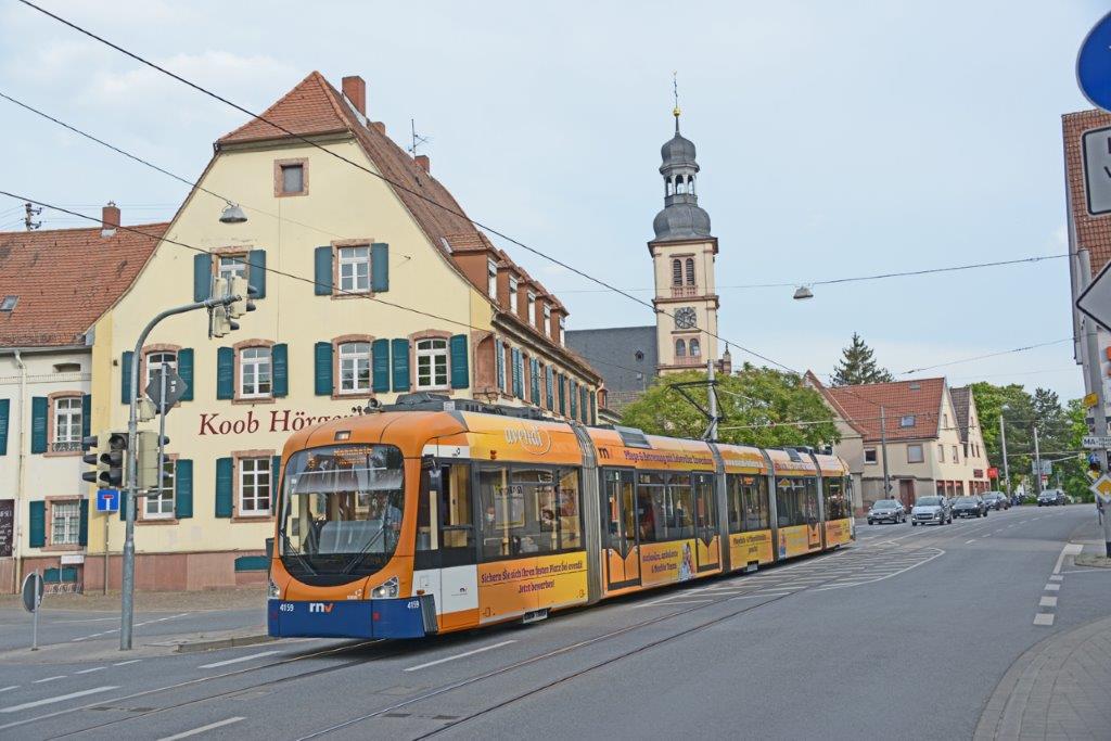 La rame 4159 RNV6ZR Variobahn Bombardier, opérant sur la grande ligne circulaire 5 Heidelberg – Mannheim – Weinheim, est photographiée dans les faubourgs de Mannheim à l’approche de l’arrêt « Seckenheim Rathaus », le vendredi 29 avril 2022. Copyright : Thierry Leleu