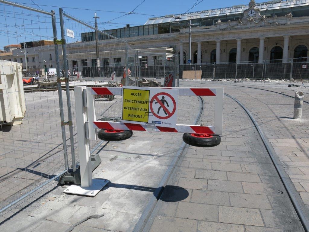 Place Auguste-Gibert, le « couloir » réservé à la circulation des rames de la ligne 3 est équipé à chaque bout d’une paire de portillons mécaniques pivotants dotés de roues horizontales que le nez des rames pousse tant à l’entrée qu’à la sortie de la zone de chantier. L’ouverture du portillon est maintenue pendant toute la durée du passage de la rame par le simple appui des pneus pleins des roues horizontales contre la face latérale droite de la rame dans le sens de la marche.
