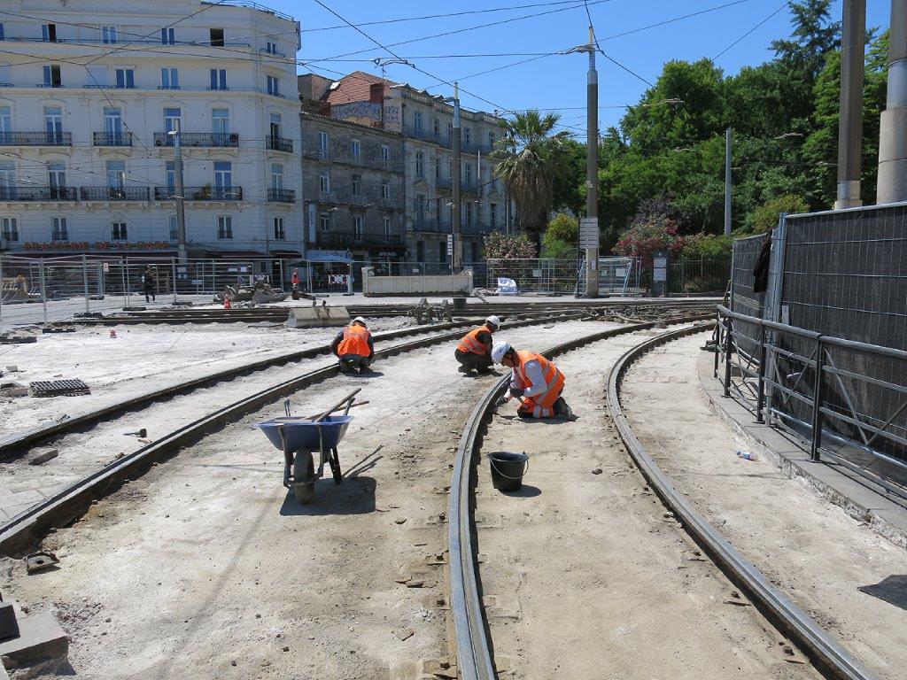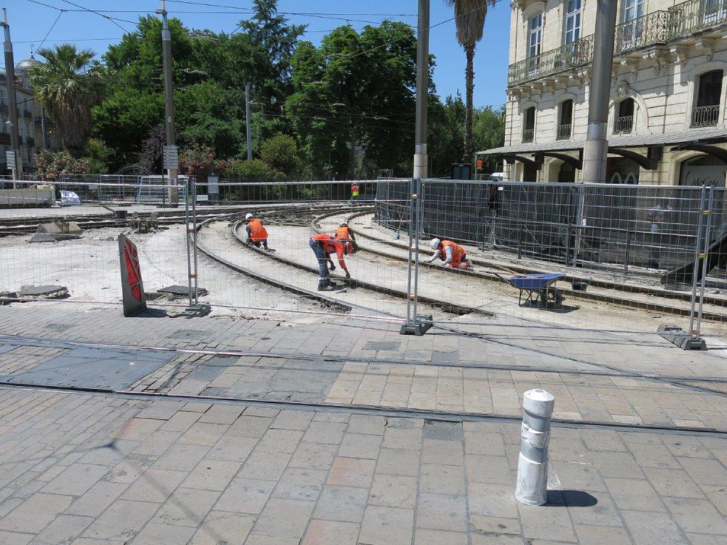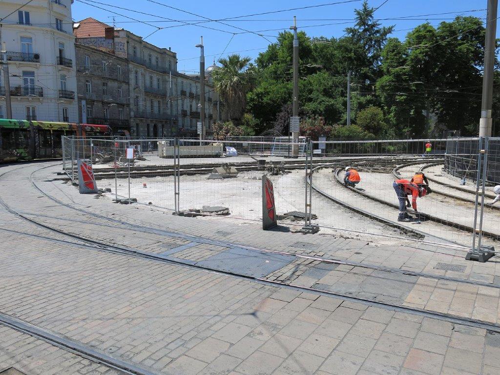 Au troisième jour de la phase 1 des travaux de rénovation d’une petite partie du réseau de tramways de Montpellier, qui se déroule du lundi 30 mai au vendredi 24 juin 2022 dans le secteur de la gare de Montpellier Saint-Roch, des rails ont été mis à nu rue Maguelone, tronc commun des lignes 1 et 2, place Auguste-Gibert, carrefour stratégique des quatre lignes de tramway où seules les rames opérant sur la ligne 3 circulent dans les deux sens et rue Jules-Ferry, côté terminus provisoire « Gare Saint-Roch » commun aux lignes 2 (tronçon ouest) et 4.