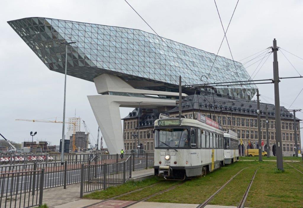 A Anvers, une unité multiple de motrices PCC La Brugeoises et Nivelles est photographiée le long du quai de départ du terminus « Havenhuis » de la ligne 24 situé à proximité de la Maison du Port, un bijou architectural signé Zaha Hadid. Prise de vue en date du mercredi 6 avril 2022. Copyright : Thierry Leleu