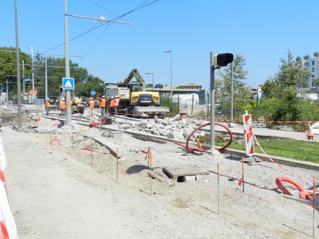 Les travaux à l’origine de la neutralisation du tronçon à voie unique séparant la station « Saint Jean le Sec » du terminus « Saint Jean de Védas – Centre » se déroulent aux abords de ce dernier, au niveau de l’aiguillage situé en aval dudit terminus.
