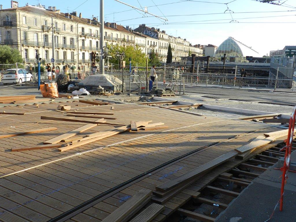 Avenue Henri-Frenay, la semaine dernière, la pose du nouveau platelage bois concernait principalement le quai direction « Mosson » de la station « Du Guesclin » propre à la ligne 1. A la jonction de l’avenue Henri-Frenay et du Pont-de-Lattes, il ne reste pratiquement plus qu’à rétablir la fosse anti-intrusion et à étaler du bitume entre cette fosse et le revêtement bitumé qui habille la plateforme du tramway sur le Pont-de-Lattes.
