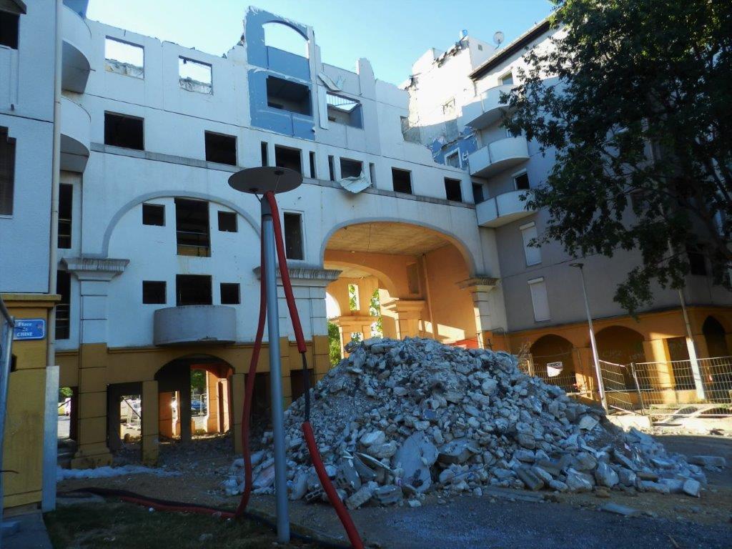 A Montpellier, photographie depuis la rue de Cheng-Du de la grande arche de la résidence Val-de-Croze et du bâtiment la surmontant en cours de démolition par la méthode de l’écrêtage, le lundi 22 août 2022. Copyright : Anje34