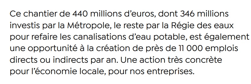 Quelques pages plus loin de ce même magazine, on apprend que 346 M€ sont investis par Montpellier Méditerranée Métropole et que 94 M€ sont financés par l’Etat français, France Relance et la Ville de Montpellier (sans aucune précision sur la répartition entre ces trois partenaires financiers, note du webmestre).