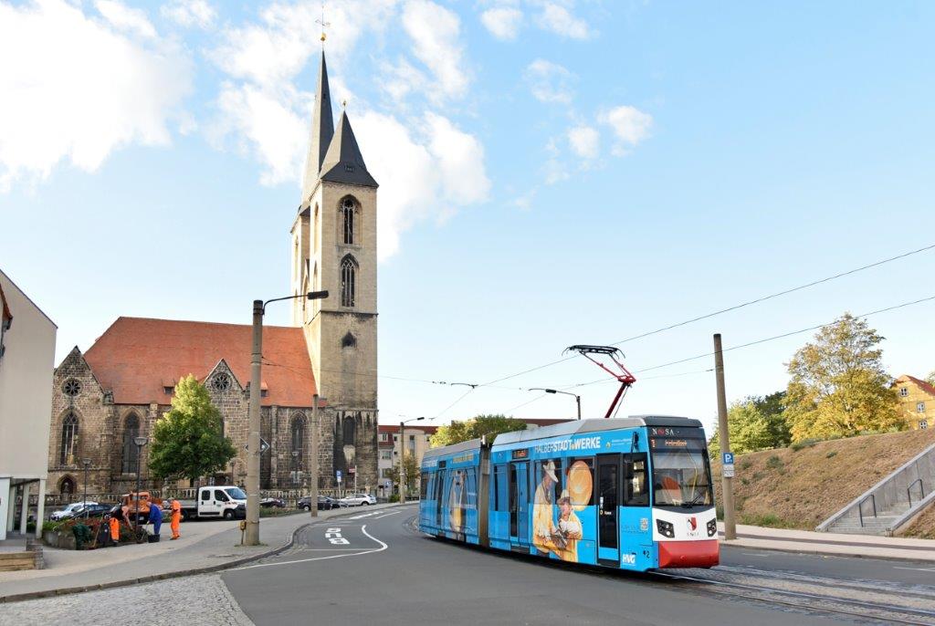 A Halbertstadt, la rame 4 NGTW6-H Leoliner FBL, opérant sur la ligne 2 en direction du terminus « Hauptbahnhof » via Herbingstraße, est photographiée au moment où elle dessert la station « Holzmarkt » commune aux lignes 1 et 2, le jeudi 1er septembre 2022. Copyright : Thierry Leleu