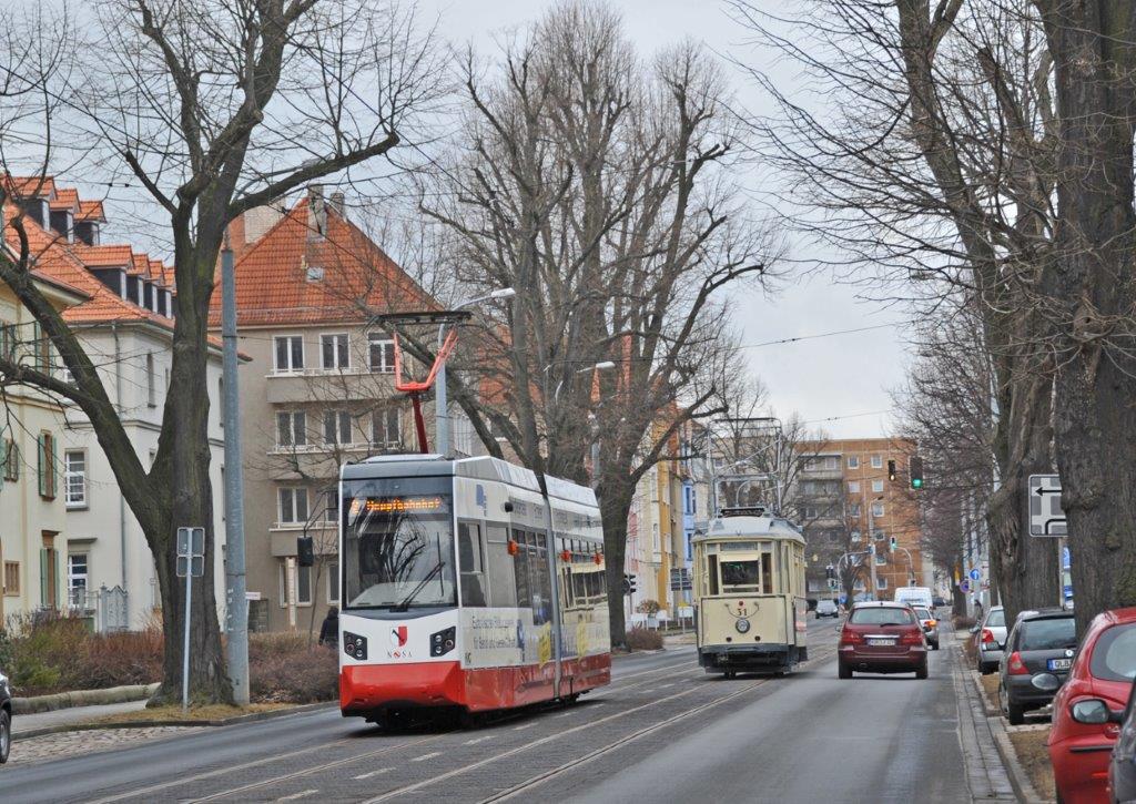 En raison d’un mauvais entretien sous le régime communiste de la République démocratique allemande (RDA), le réseau de tramways est sur le point d’être fermé à la fin des années 1980. Après la réunification allemande, les voies à écartement métrique et les lignes aériennes de contact alimentées en 600 V courant continu sont renouvelées et cinq rames articulées unidirectionnelles à plancher surbaissé de type NGTW6-H Leoliner sont commandées auprès du constructeur allemand Fahrzeug-Bau Leipzig GmbH (FBL) qui livrera une unité en octobre 2006, deux unités en décembre 2006 et deux unités en février 2007.