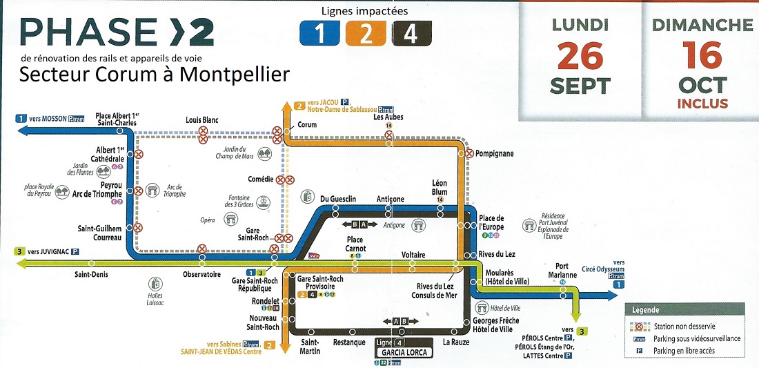 La deuxième tranche ou phase de travaux de rénovation des rails et appareils de voie dans le secteur Corum à Montpellier courra du lundi 26 septembre au dimanche 16 octobre 2022 inclus. Elle fait suite à une première tranche de travaux de même nature entamée le lundi 29 août 2022. Une troisième et dernière tranche dans ce secteur Corum se déroulera du lundi 17 octobre au vendredi 25 novembre 2022 inclus.