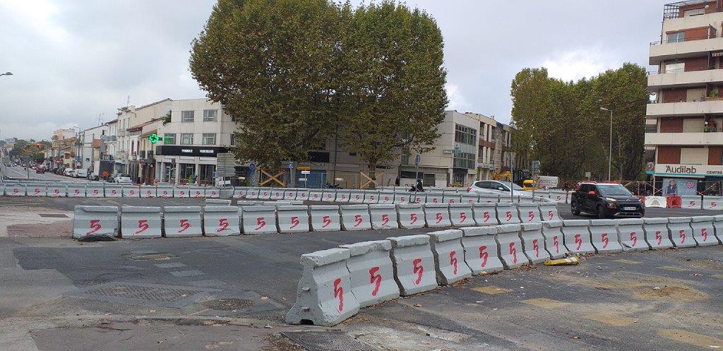 Entamé à la fin du mois du mois de septembre 2022, le supplice consistant à devoir peindre au pochoir le chiffre 5 sur chaque face de plusieurs dizaines de séparateurs de voies en béton, après avoir appliqué au préalable sur celles-ci une couche blanche puis une couche gris clair, s’est achevé dans le courant du mois d’octobre 2022, place du 8-Mai-1945 à Montpellier.