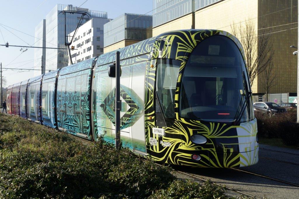 1er novembre 2022 – A Lyon, la rame 857 Citadis 302 Alstom a revêtu une livrée intégrale intitulée « L’Art du mouvement », une œuvre originale signée Tony Noël
