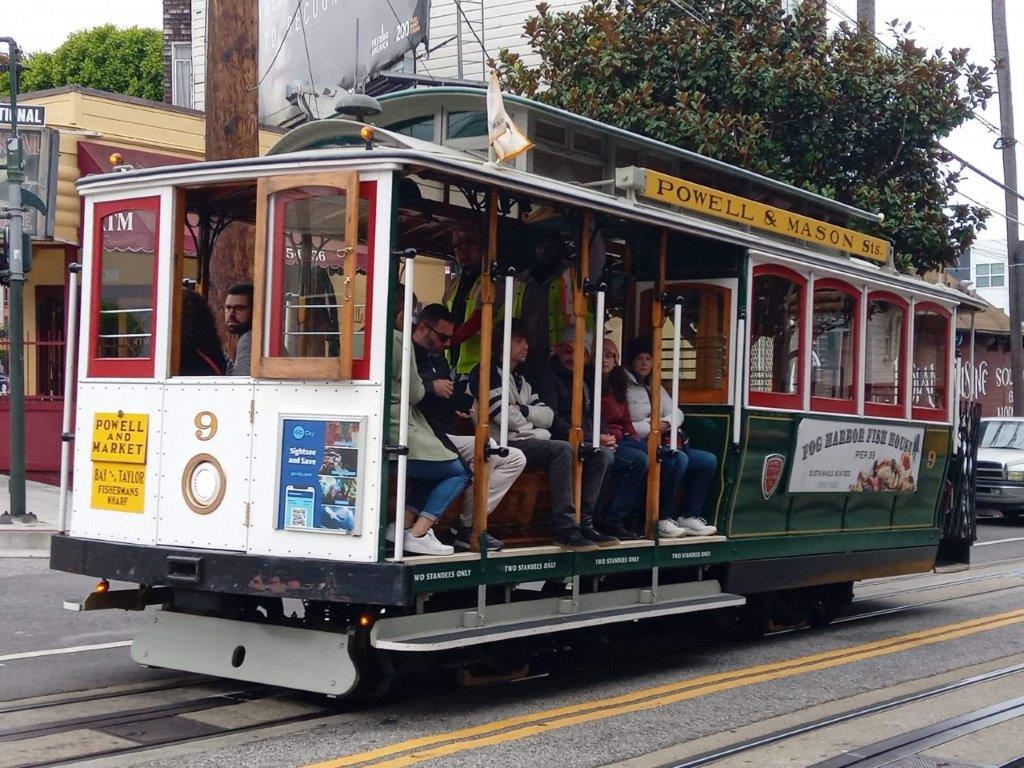 Taylor Street à San Francisco, le cable car n° 9, opérant sur la ligne Powell-Mason en direction du terminus sud « Powell Street & Market Street », est photographié entre le terminus nord « Taylor Street & Bay Street » et l’arrêt « Taylor Street & Columbus Avenue », le vendredi 14 octobre 2022. Copyright : Karine D