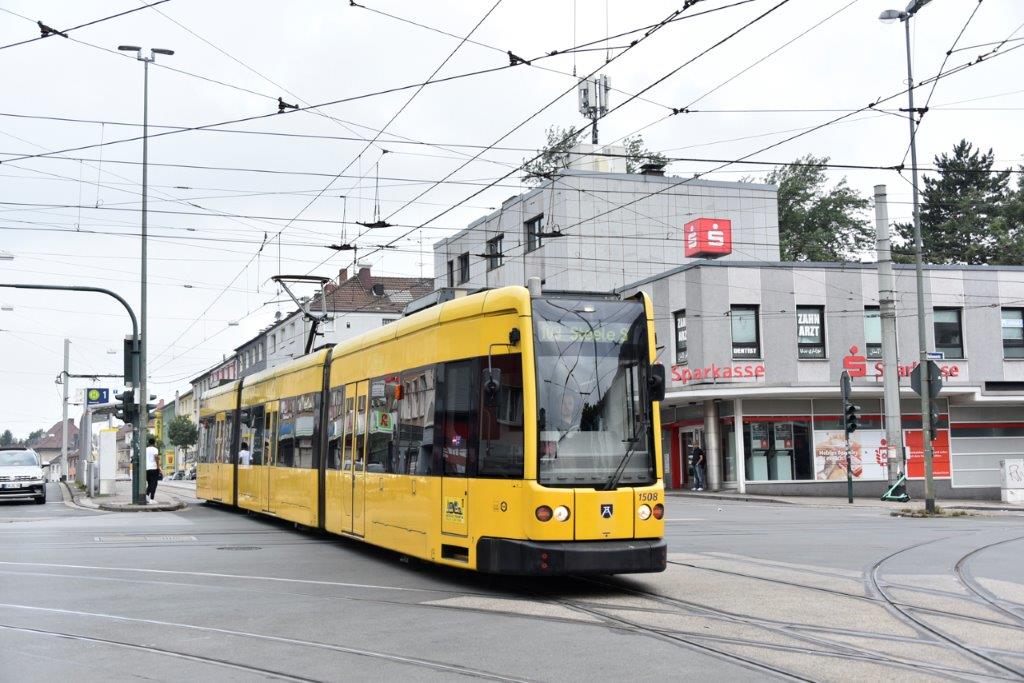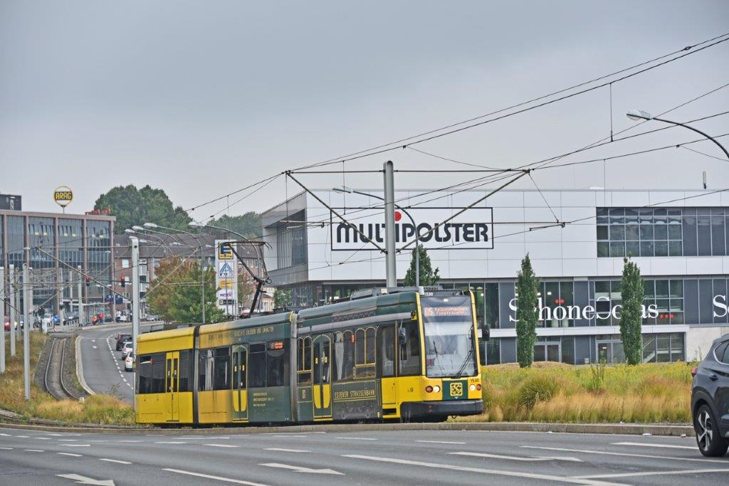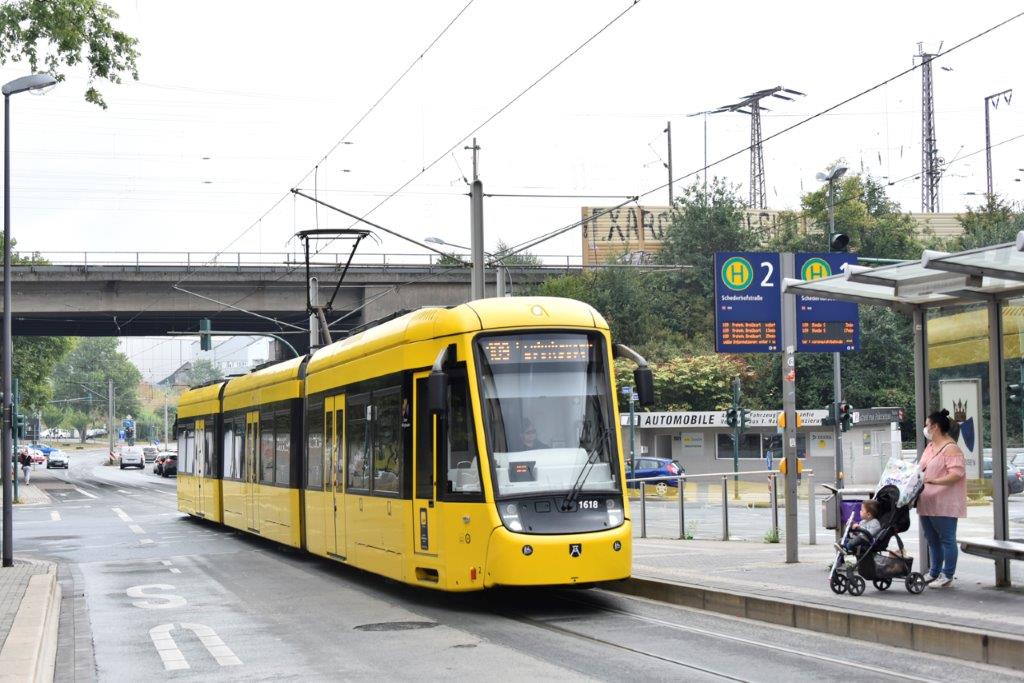 A Essen, la rame 1513 M8D-NF DWA/ADtranz à écartement métrique, opérant sur la ligne 105 du réseau Essen/Mülheim en direction du terminus « Rellinghausen Finefraustraße » à Essen, est photographiée au moment où elle quitte la station « Helenenstraße » commune aux lignes 103 et 105, le samedi 20 août 2022. Copyright : Thierry Leleu
