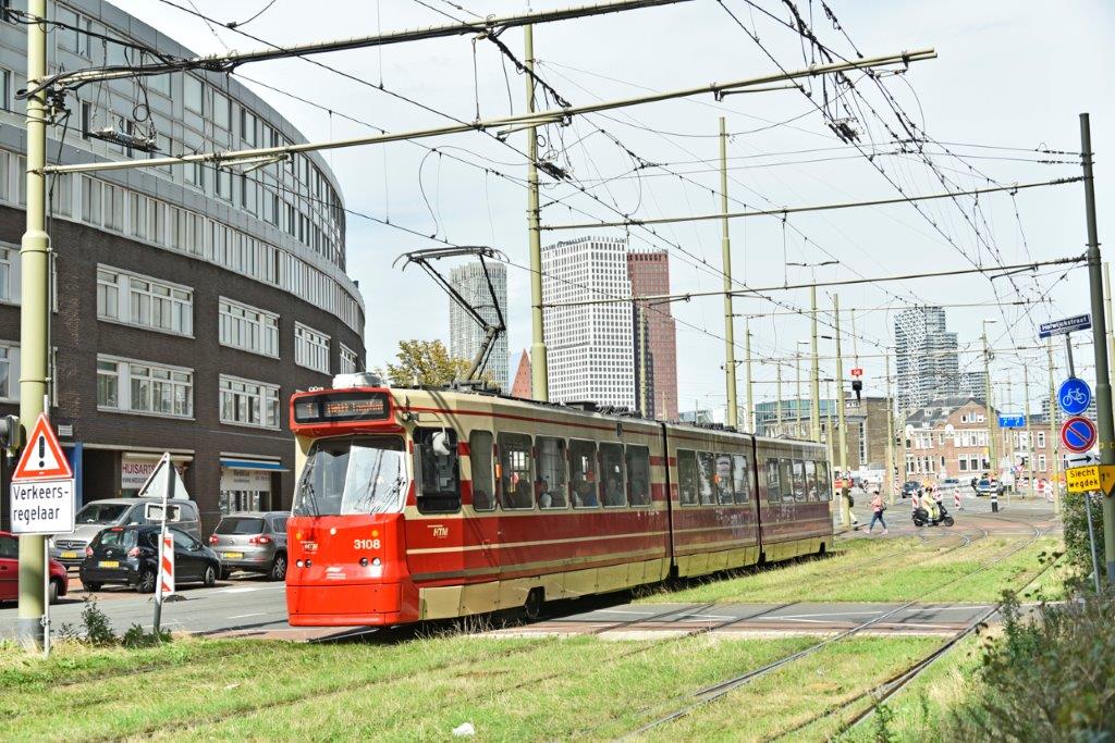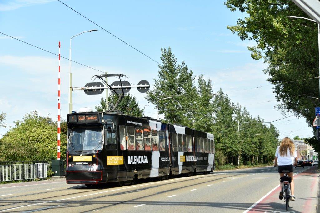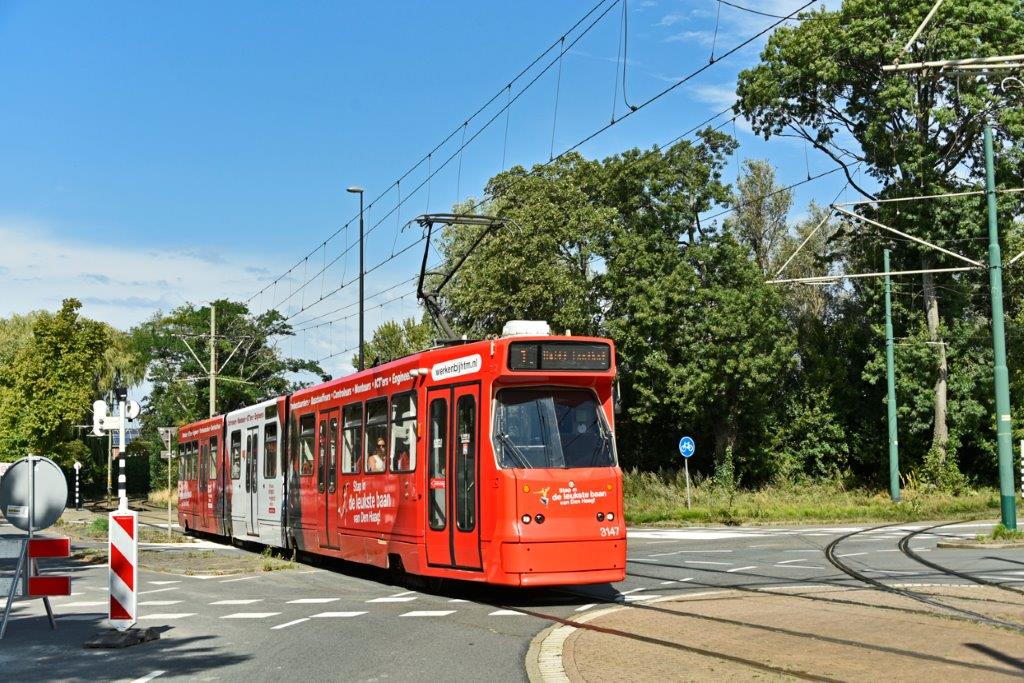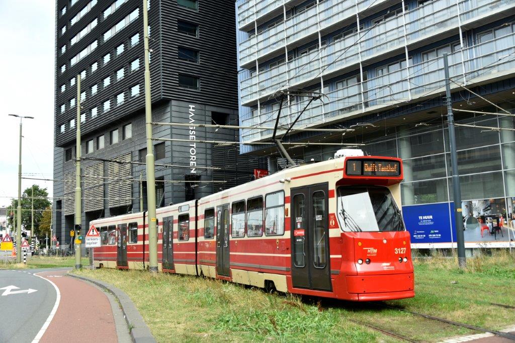 Rijswijkseplein à La Haye, la rame 3127 GTL8-II BN, opérant sur la ligne 1 en direction du terminus « Scheveningen Noord », est photographiée entre les stations « Station Den Haag HS » et « Bierkade » sur le tronc commun des lignes 1, 9, 15 et 16, le lundi 5 septembre 2022. Copyright : Thierry Leleu